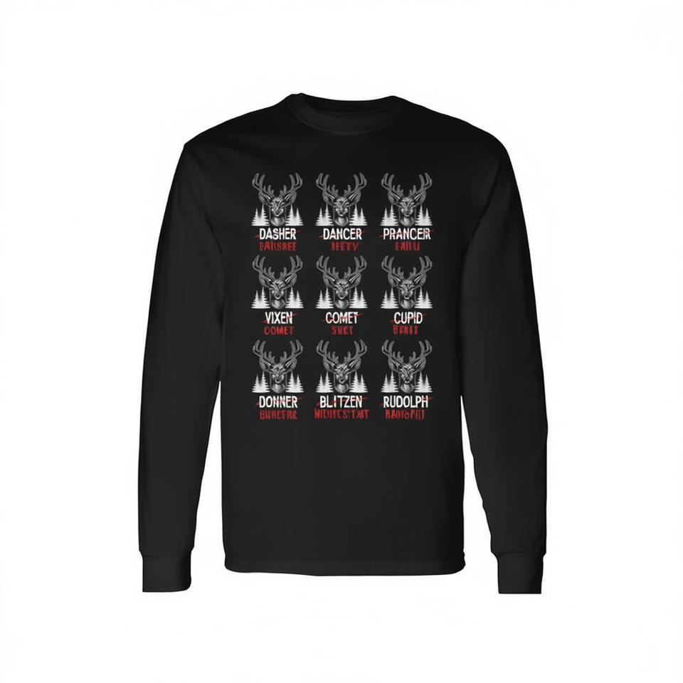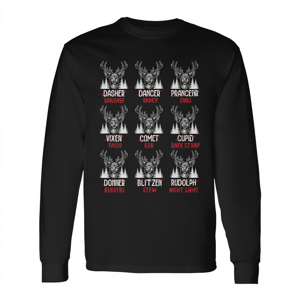 T-shirt à manches longues unisexe pour adulte, col rond, impression numérique, motif « Noms de rennes barrés », blague de chasseur de gibier