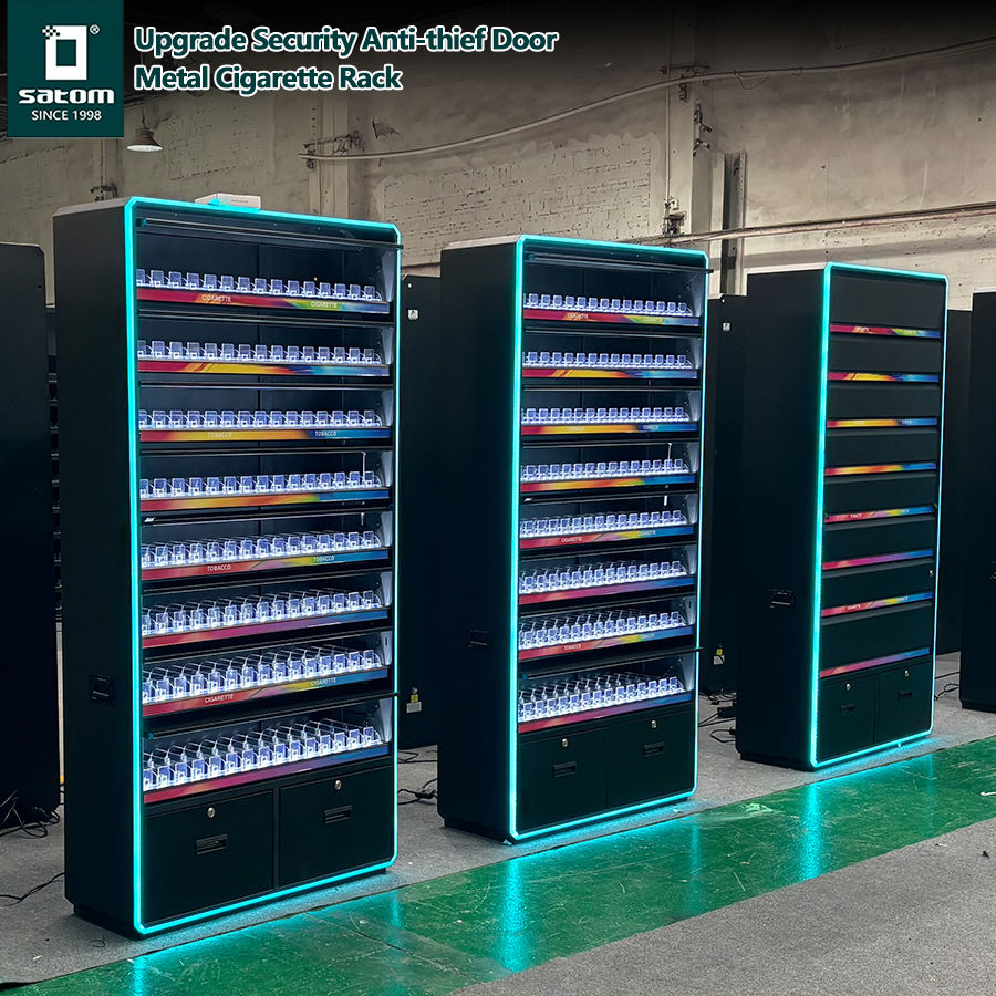 Renforcement métal cigarette fumée boutique présentoir avec poussoir sécurité serrure porte bleu éclairage magasin atmosphère