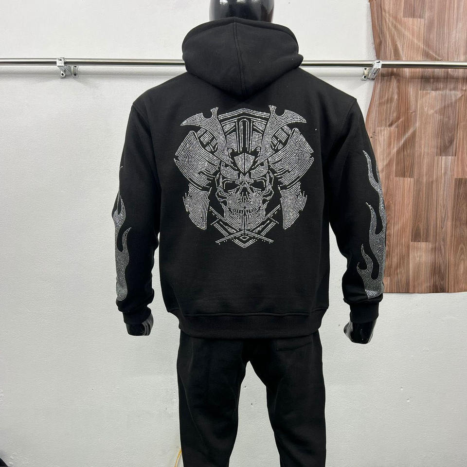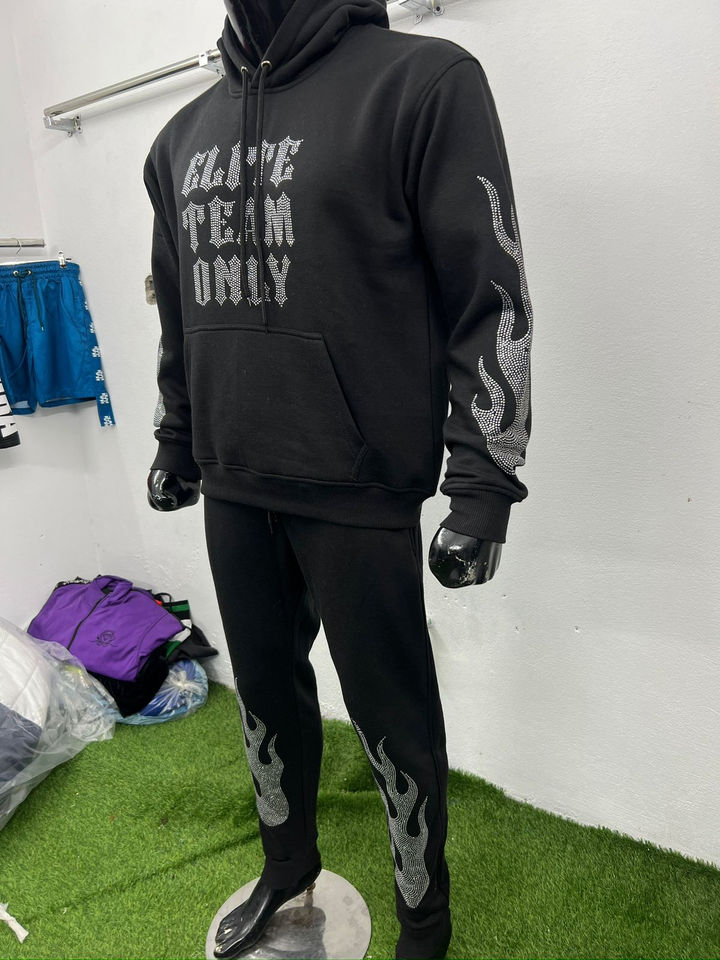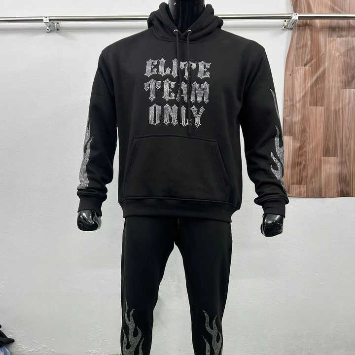 Ensemble de survêtement personnalisé avec logo imprimé et strass, coupe décontractée, pour un usage quotidien, comprenant un sweat à capuche et un pantalon de survêtement brillants.
