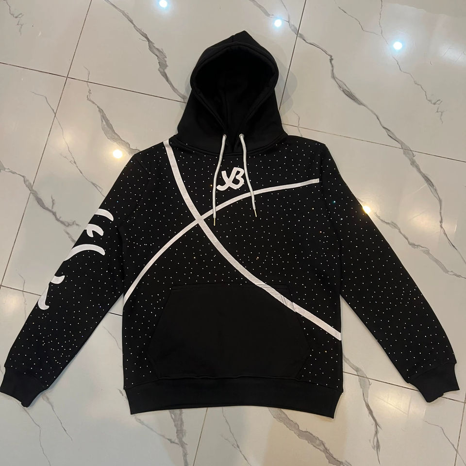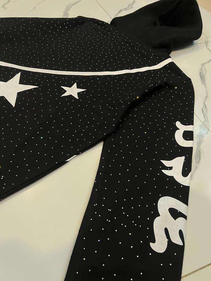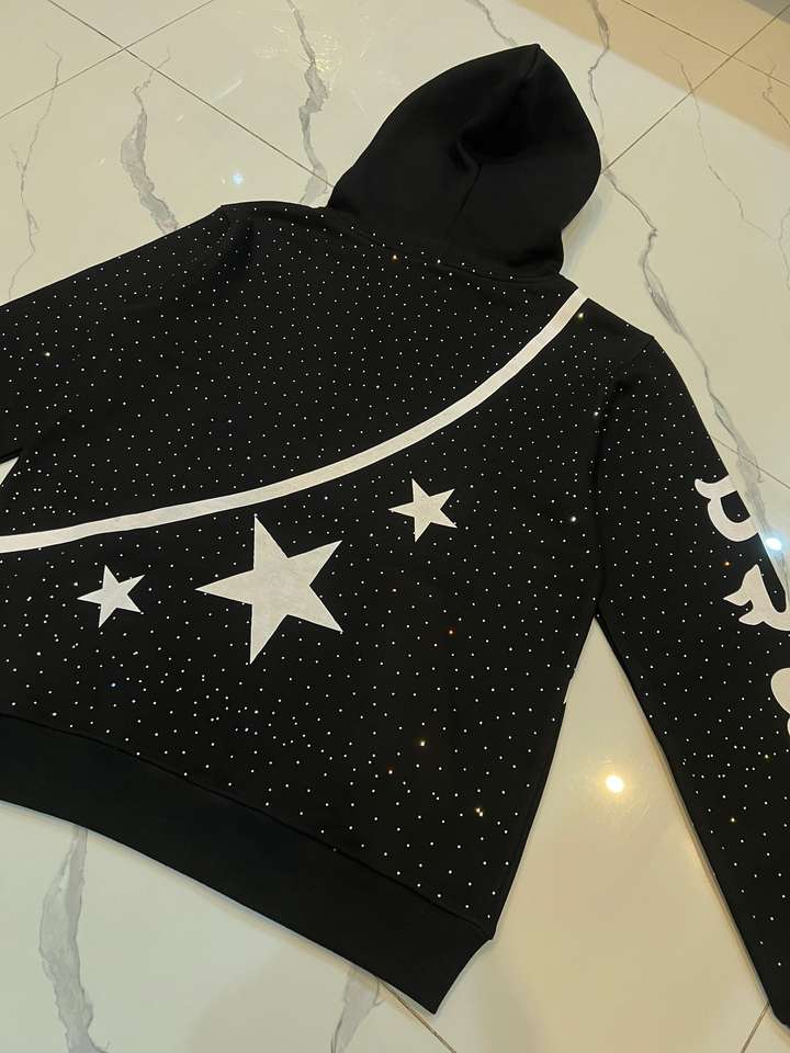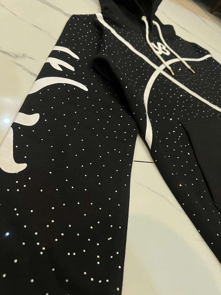 Sweat-shirt à capuche surdimensionné Relicstar en coton 100% avec strass noirs et impression graphique, style streetwear urbain