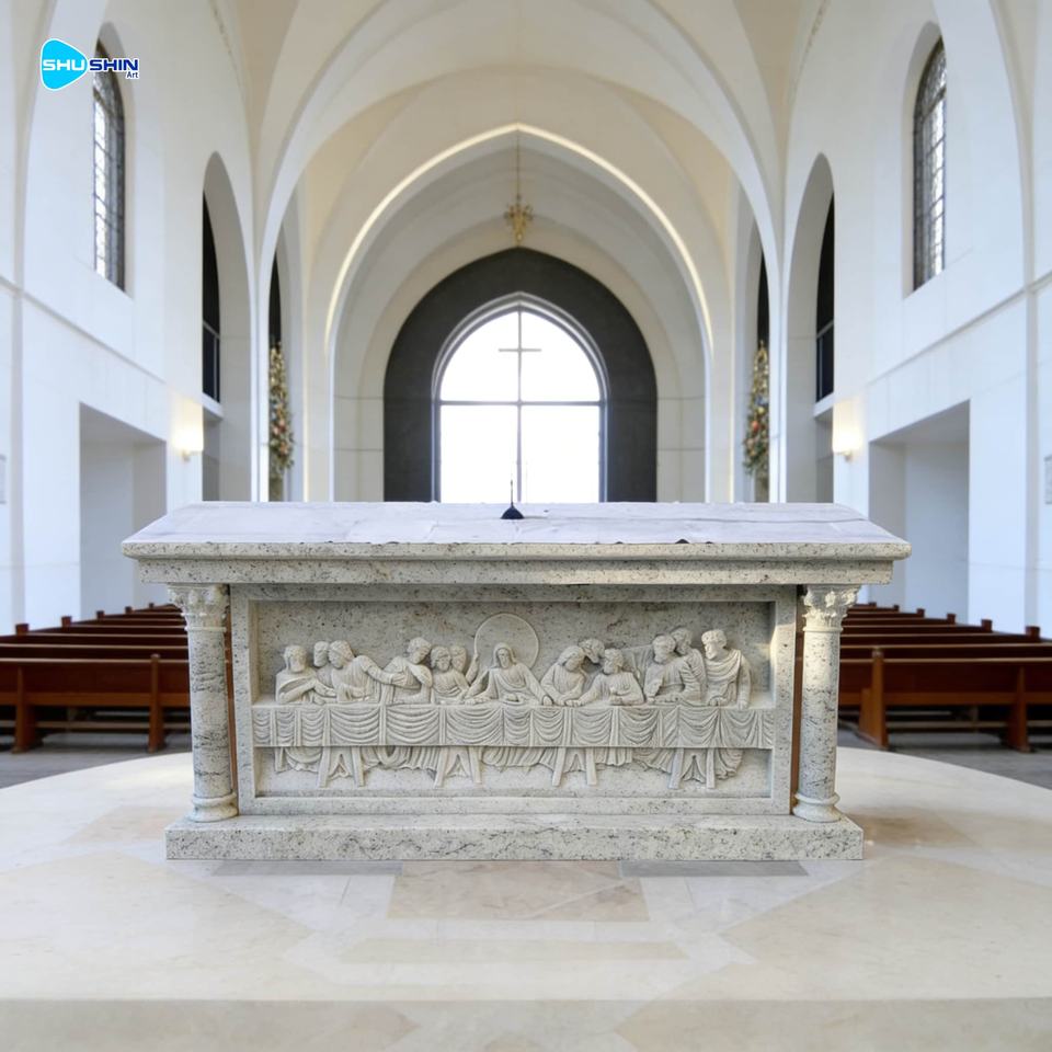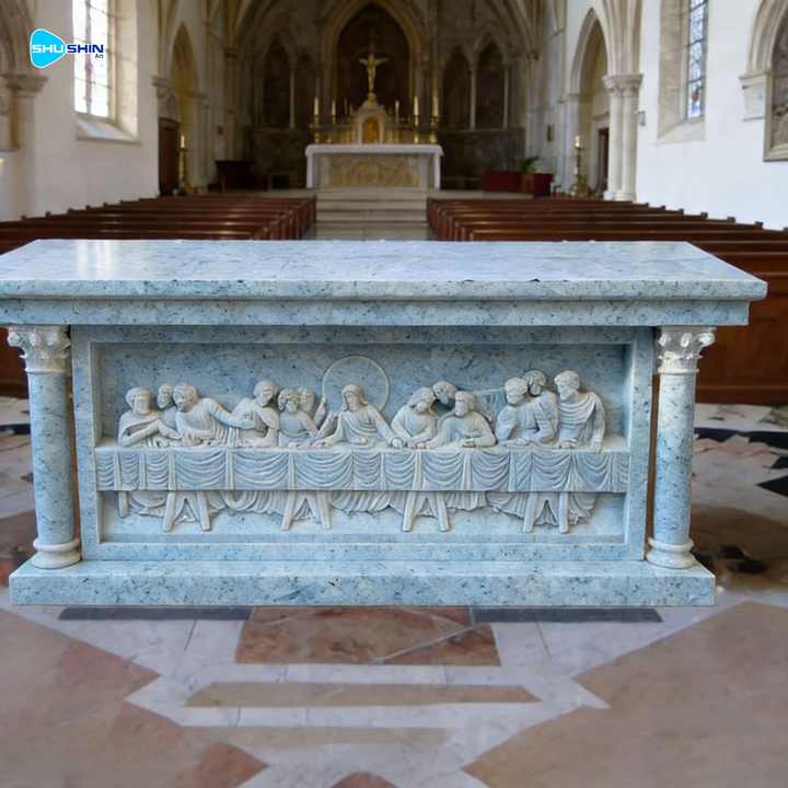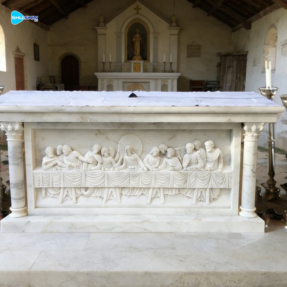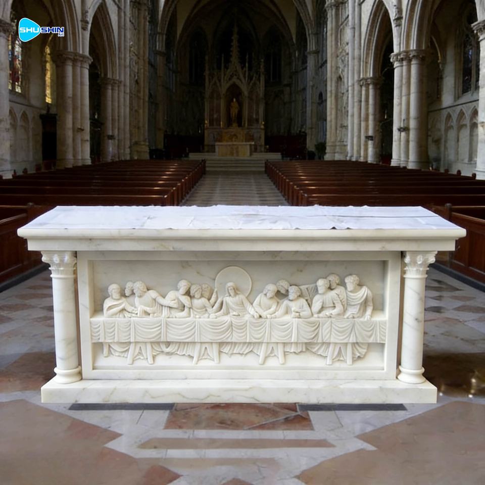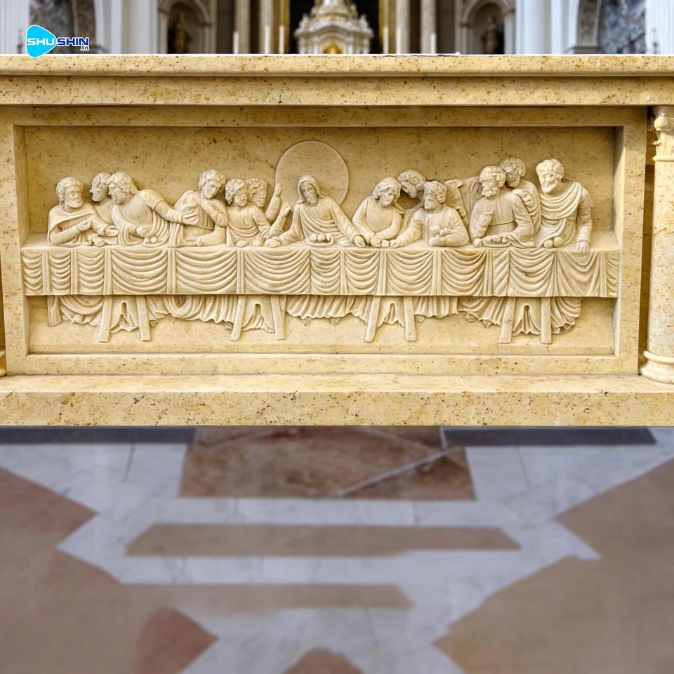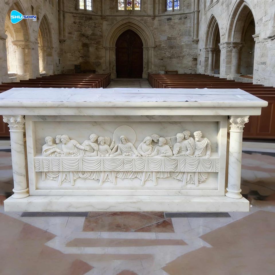 Table d'autel en marbre naturel sculpté à la main, église catholique religieuse, design européen