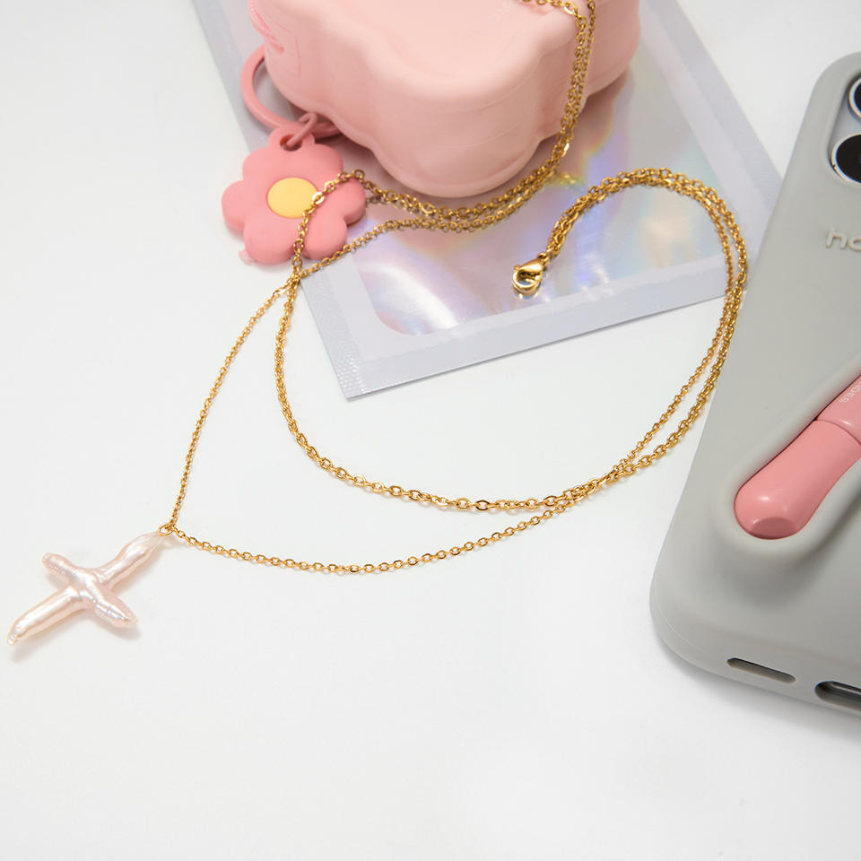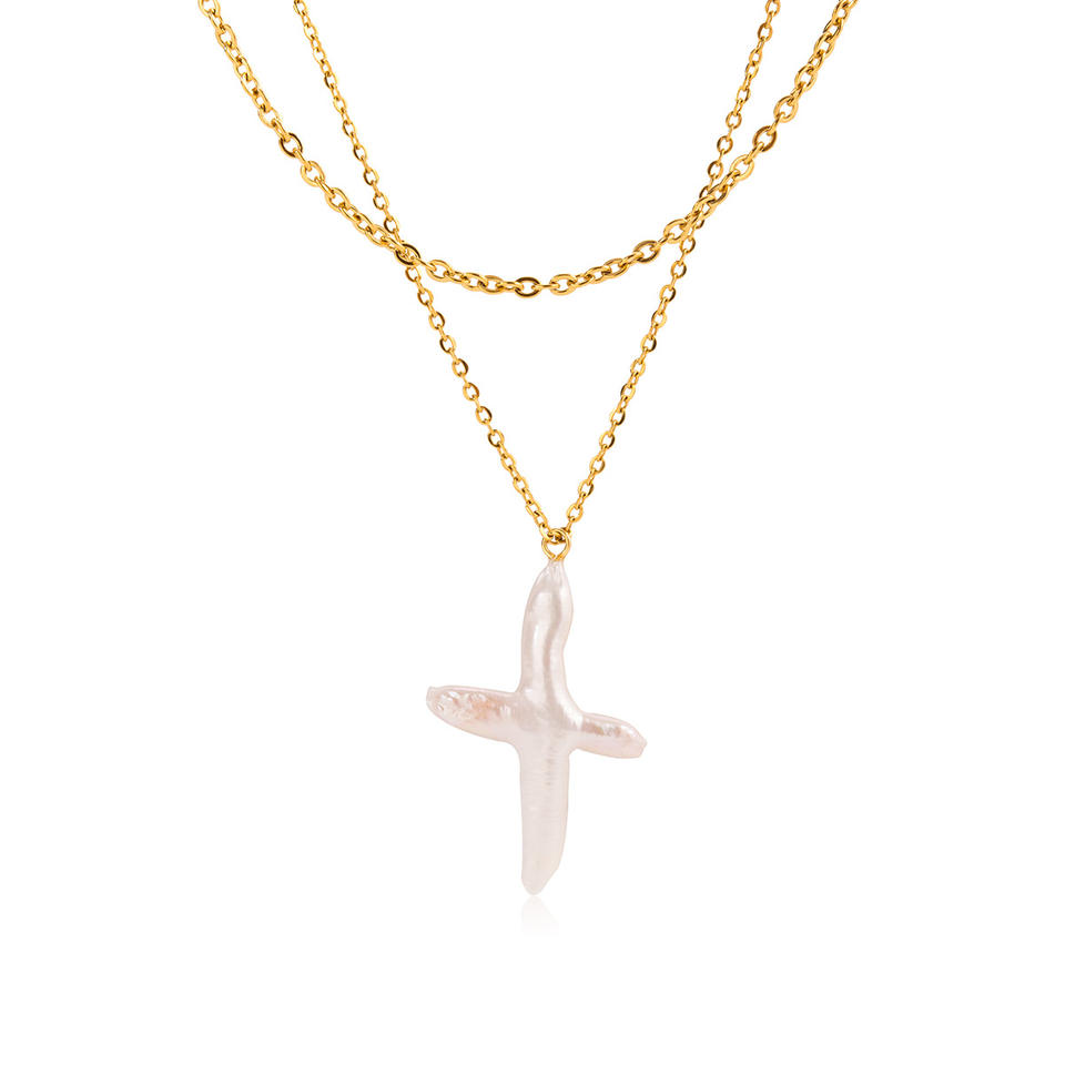 Collier religieux chrétien à double chaîne, étanche, plaqué or 18 carats, avec pendentif croix en perle d'eau douce