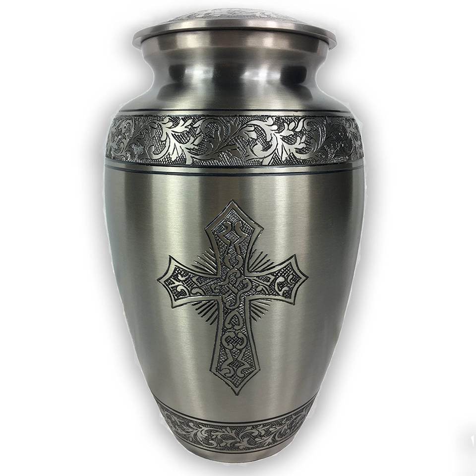 2025 Urnes funéraires de conception gravée de croix religieuse pour les cendres Nouveau design Urnes en métal faites à la main Fabricant en gros