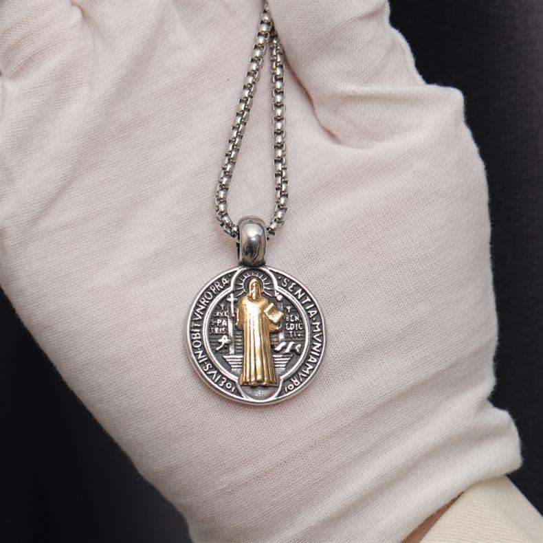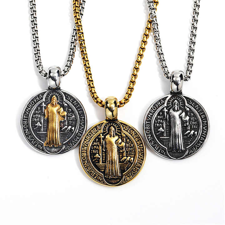 Collier pendentif médaillon en métal religieux rond avec croix de Jésus, Saint Benoît, bijoux catholiques