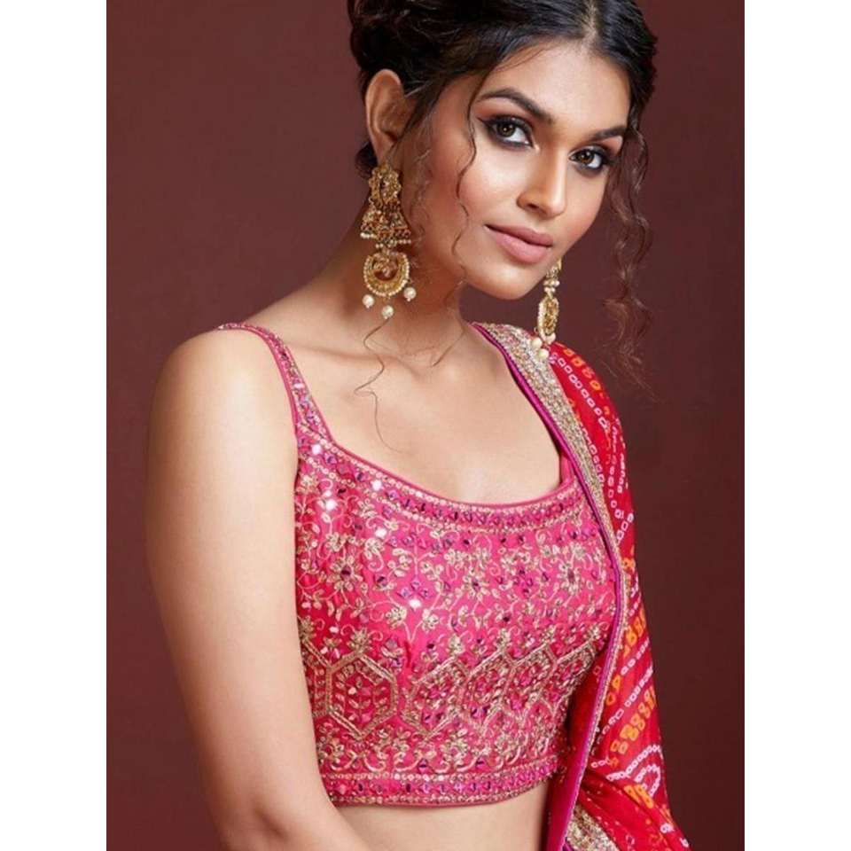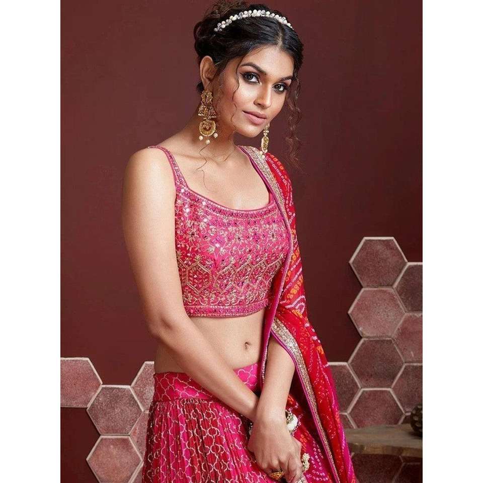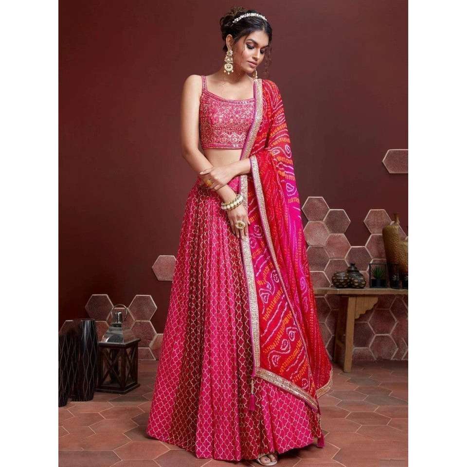 Remarquable Paillettes Roses Broderie Chinon Soie Lehenga Choli