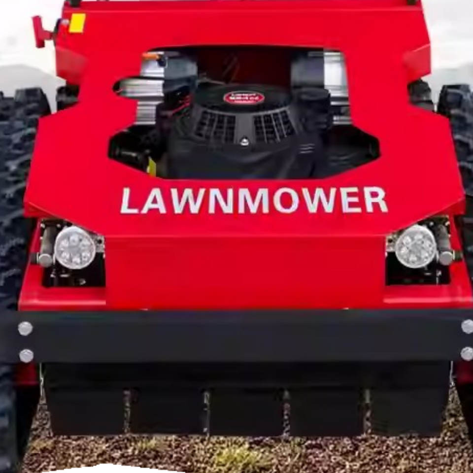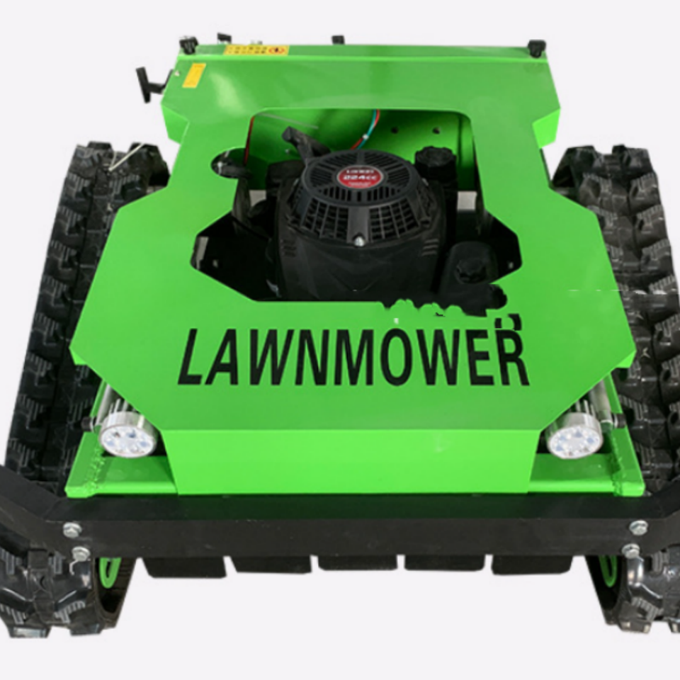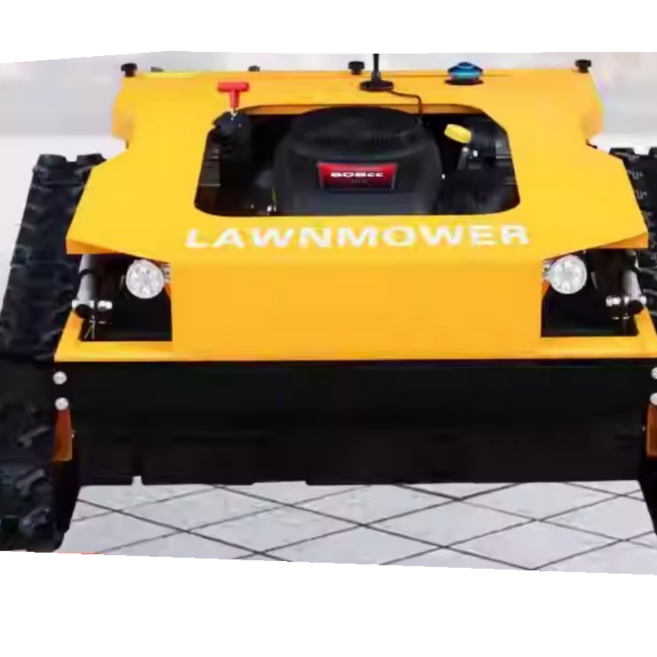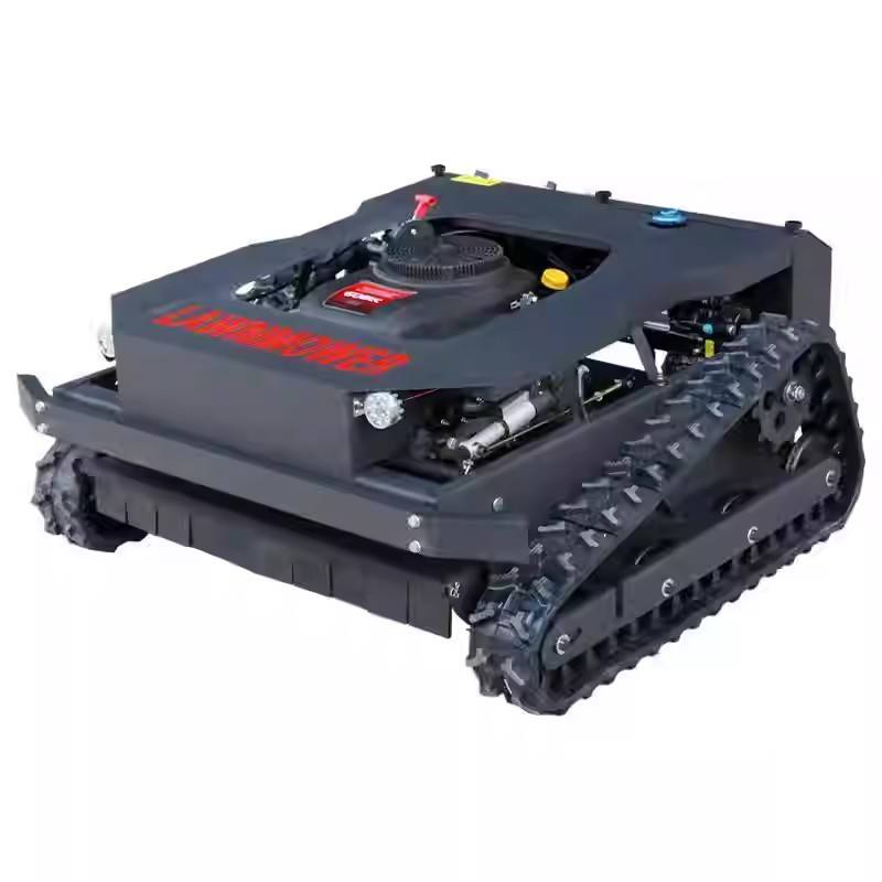 Désherbeuse industrielle télécommandée 4 temps pour usage domestique avec moteur essence 7 CV 224 cm³ et bac de ramassage 150 L à décharge latérale