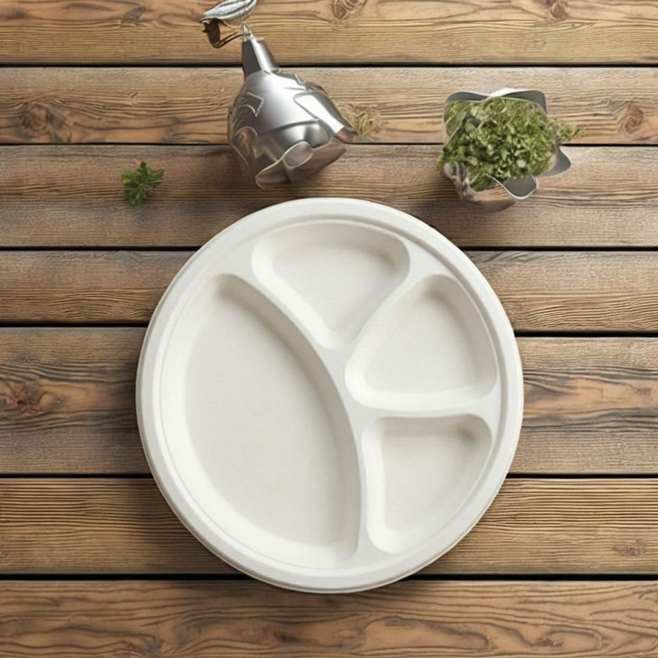 Assiettes en bagasse de 12 pouces, 4 compartiments, en pulpe de canne à sucre, pour mariages et buffets