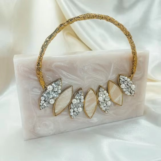 Pochette de soirée de luxe pour femmes avec chaînes de perles en résine et perles florales pour mariages et fêtes