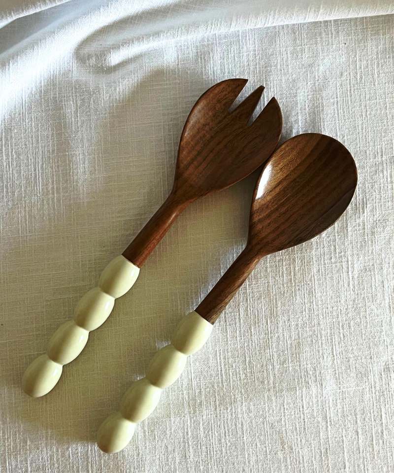 Ensemble d'ustensiles de cuisine en bois de manguier d'acacia naturel fabriqué en Inde poignée imprimée serveur à salade inclus