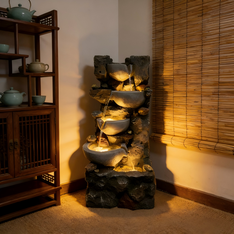 Fontaine d'eau en cascade à quatre niveaux en résine imitation pierre avec lumières LED pour la décoration intérieure et extérieure du jardin et du patio