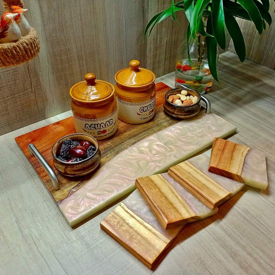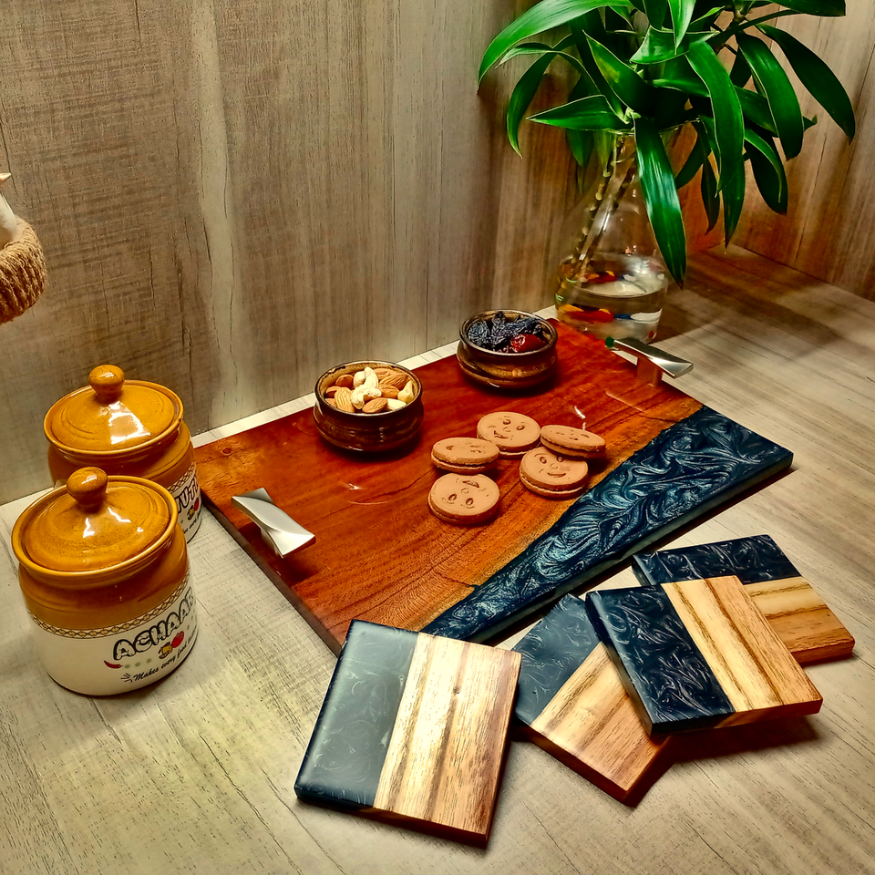 Resin & Wooden Tea Coffee Serving Tray Gray resin and with coaster kitchen accessories metal Handle