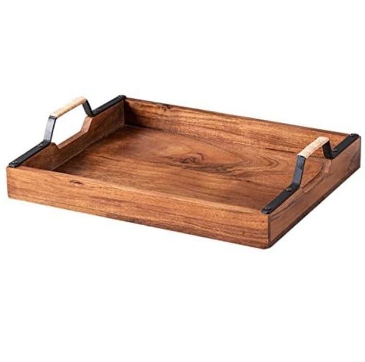 Plateau de service en rotin et bois, design classique, avec poignée métallique, pour restaurant, café, hôtel, service de plats, aliments, fruits, café