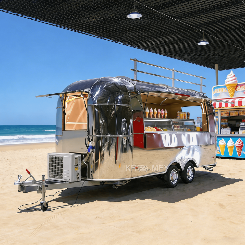 Camion de restauration mobile en acier inoxydable, remorque de vente de snacks et boissons, avec caractéristiques anti-rouille, idéal pour les glaces et les événements.