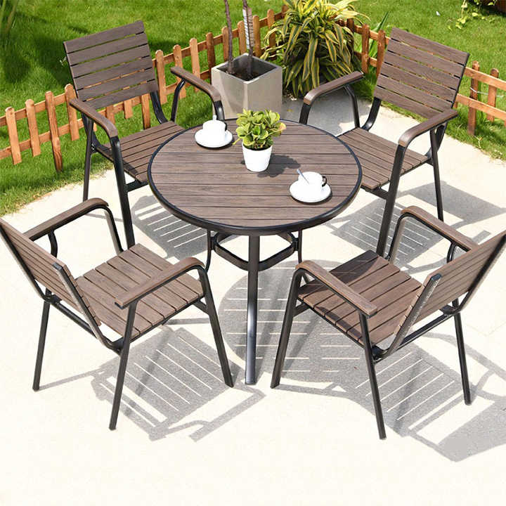 Restaurant café piscine pique-nique café terrasse jardin ensemble de salle à manger fonte 4 personnes rond plastique bois extérieur tables et chaises ensemble