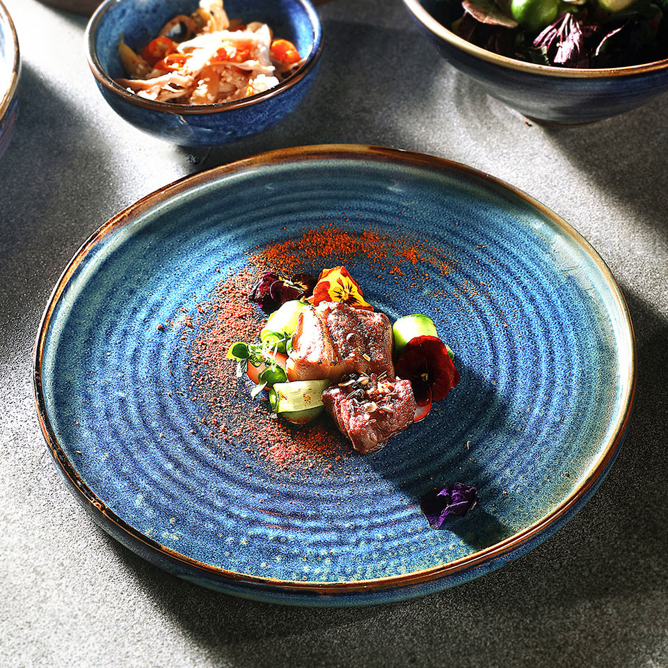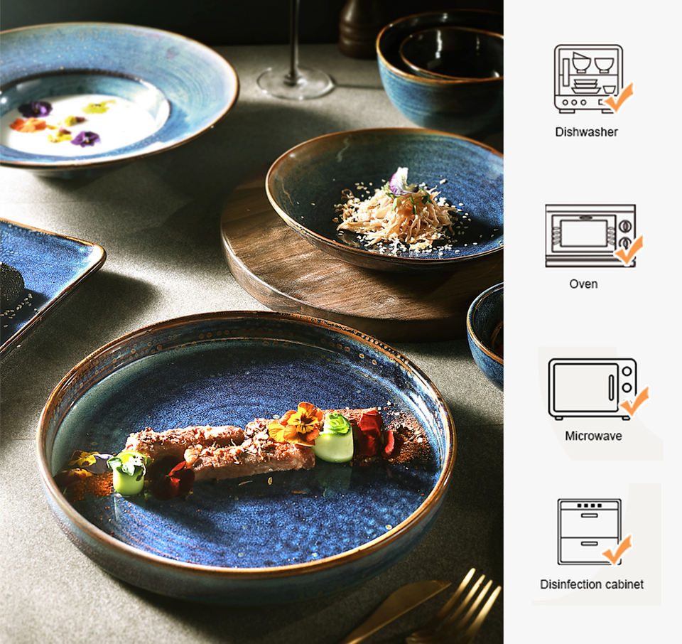 Service de table de restaurant en porcelaine, vaisselle en céramique artisanale, assiettes, tasses, vaisselle en grès, bol, vaisselle en céramique durable de couleur bleue