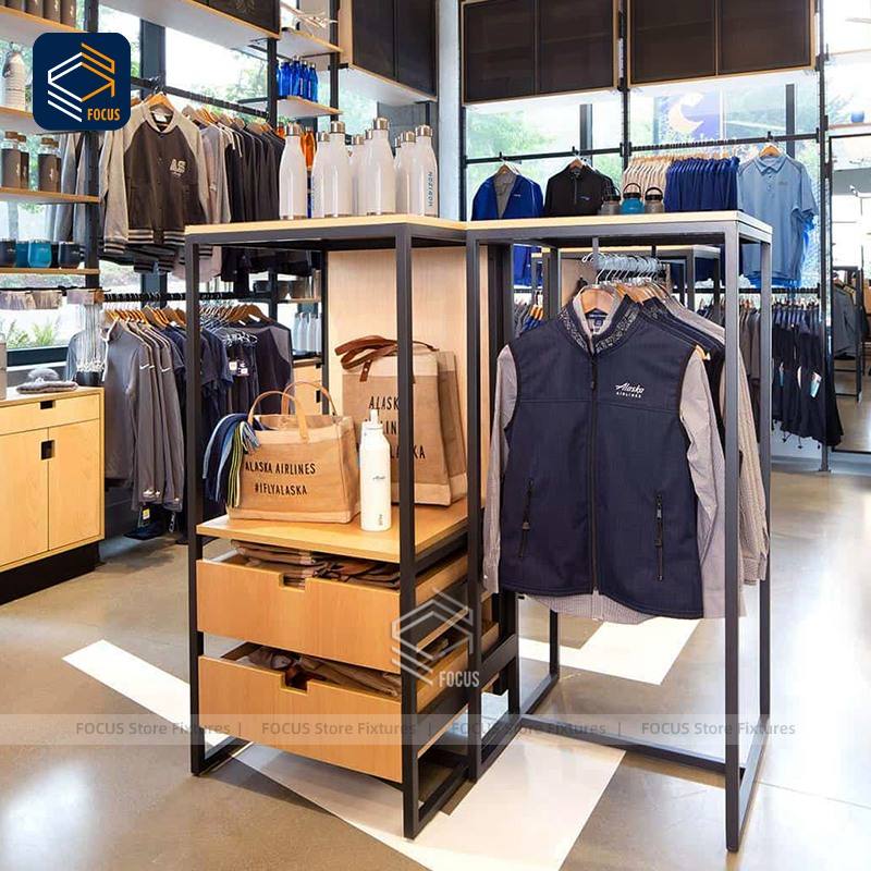 Vitrine pour vêtements au détail Étagère murale à grille modulaire Support suspendu pour vêtements et table pliante Présentoir pour vêtements personnalisé