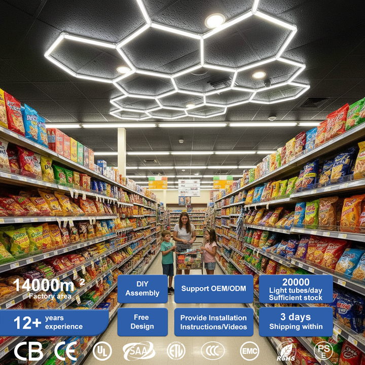 Luminaires de plafond modulaires hexagonaux à LED pour magasins de détail, à montage facile, pour usage commercial intensif