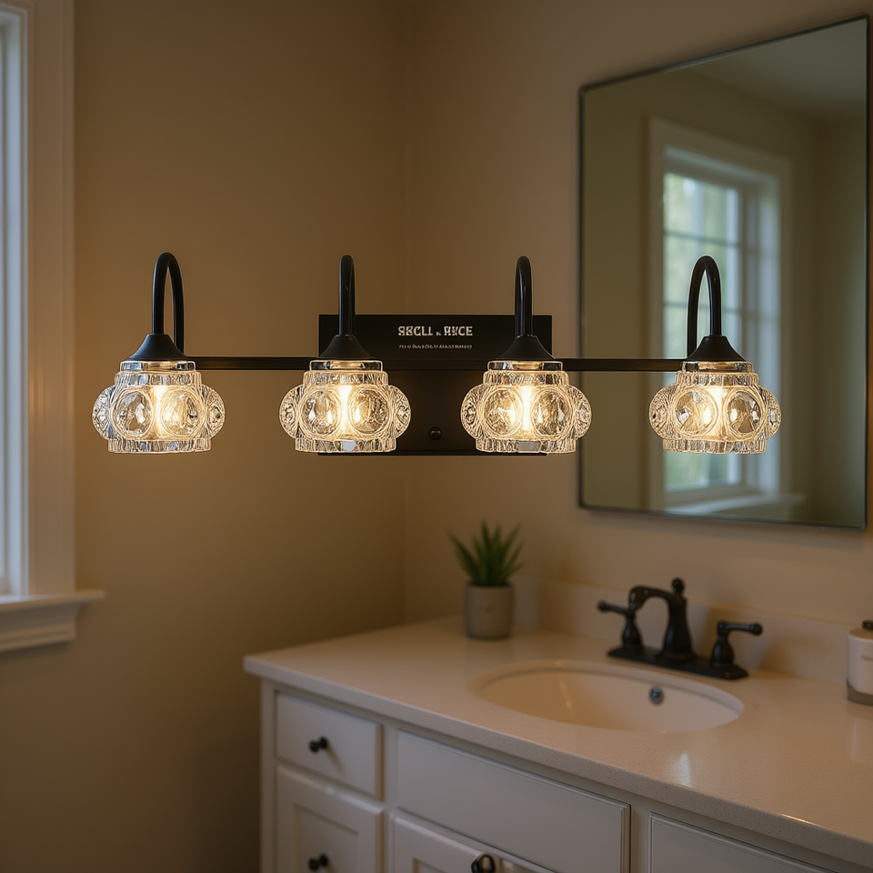 Luminaire de salle de bain rétro à 4 lumières, finition noire, abat-jour en verre cristal, LED blanc chaud, lampes murales pour miroir