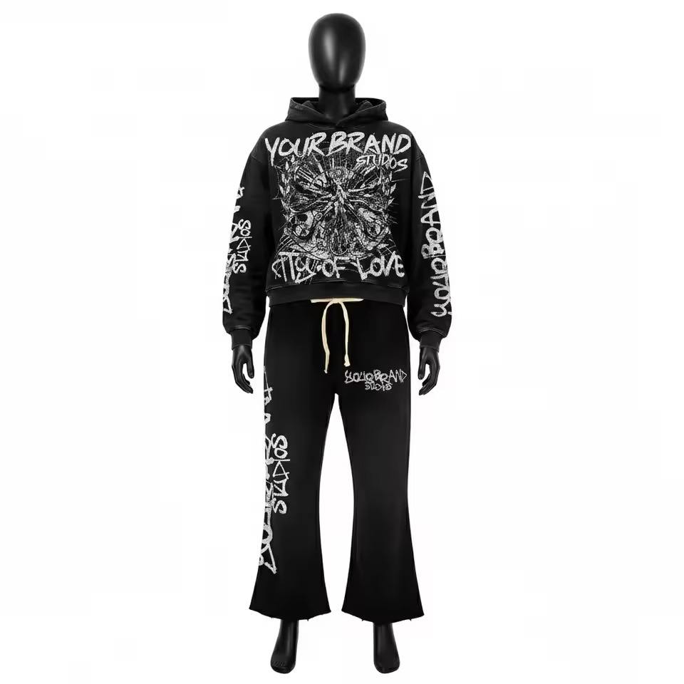Nom du produit:Rétro Acide Lavage Cropped Hoodie Ensemble Pantalon de survêtement évasé & Graphique Personnalisé