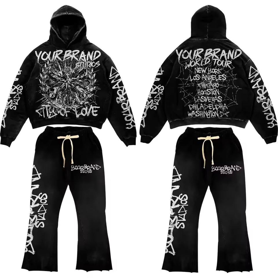Ensemble sweat à capuche court rétro délavé à l'acide pantalon de survêtement évasé et impression graphique personnalisée | Survêtement Streetwear de luxe
