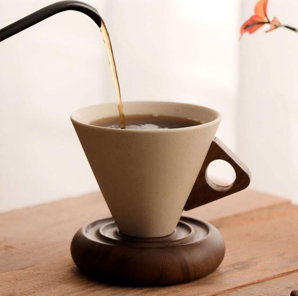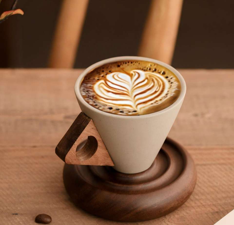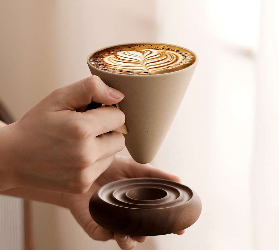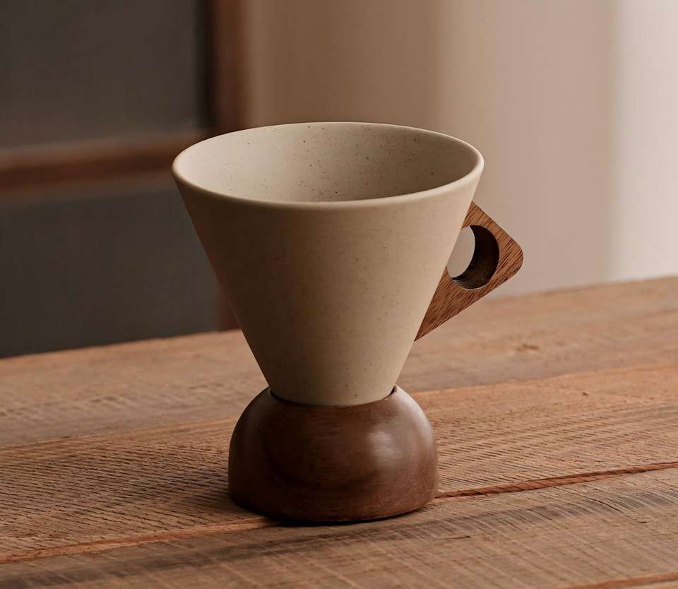 Tasse à café en poterie brute avec base en bois