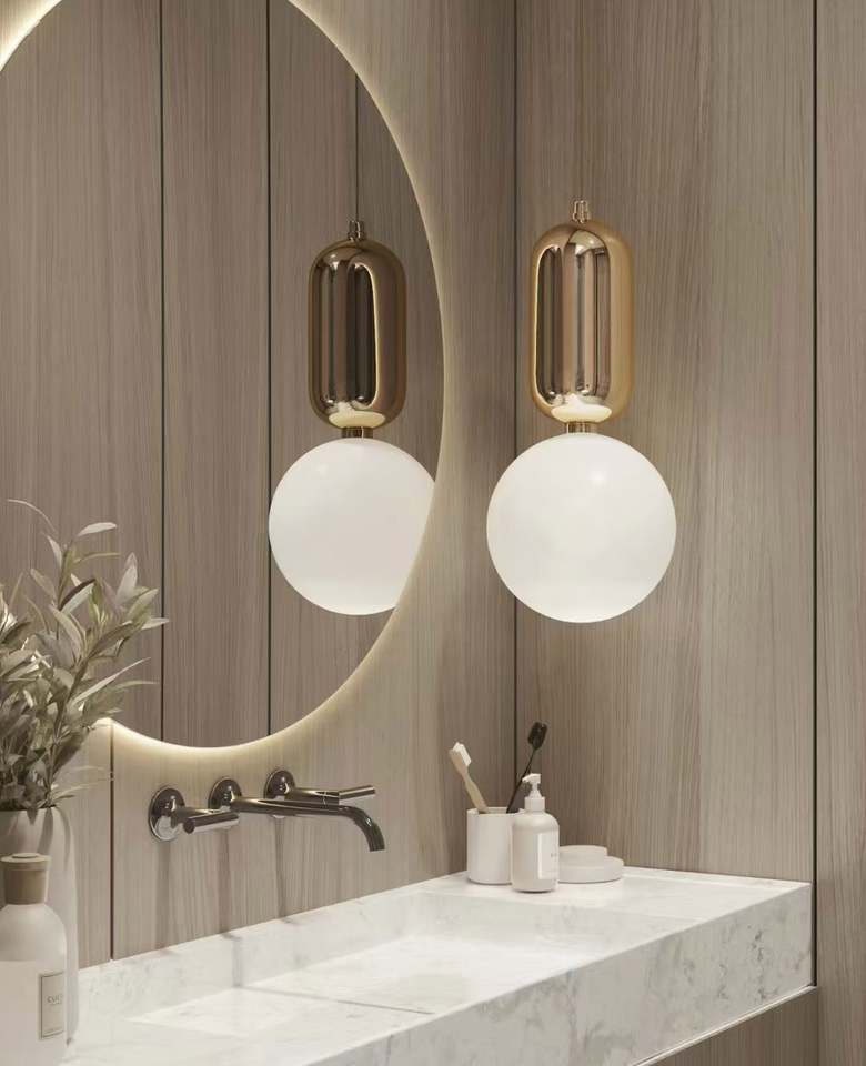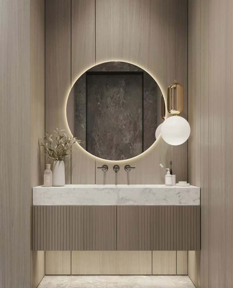 Meuble-lavabo de salle de bain simple en bois massif de couleur foncée rétro, série Gery avancée, avec miroir rond