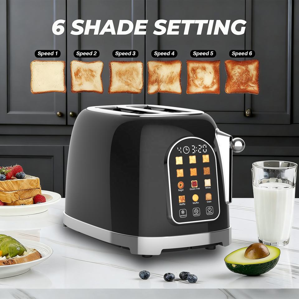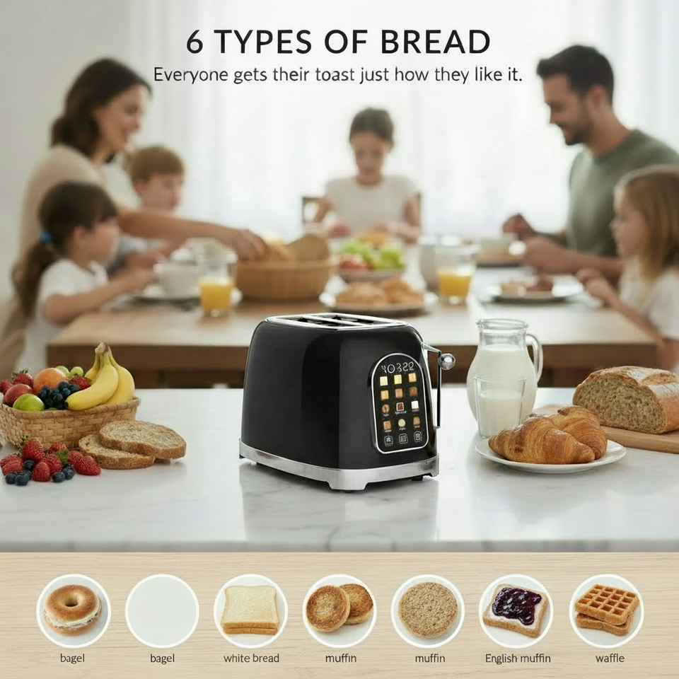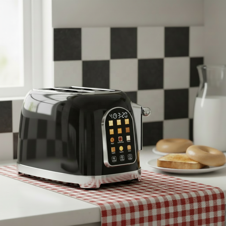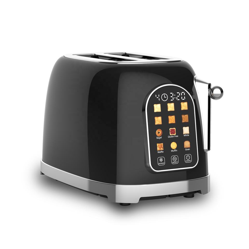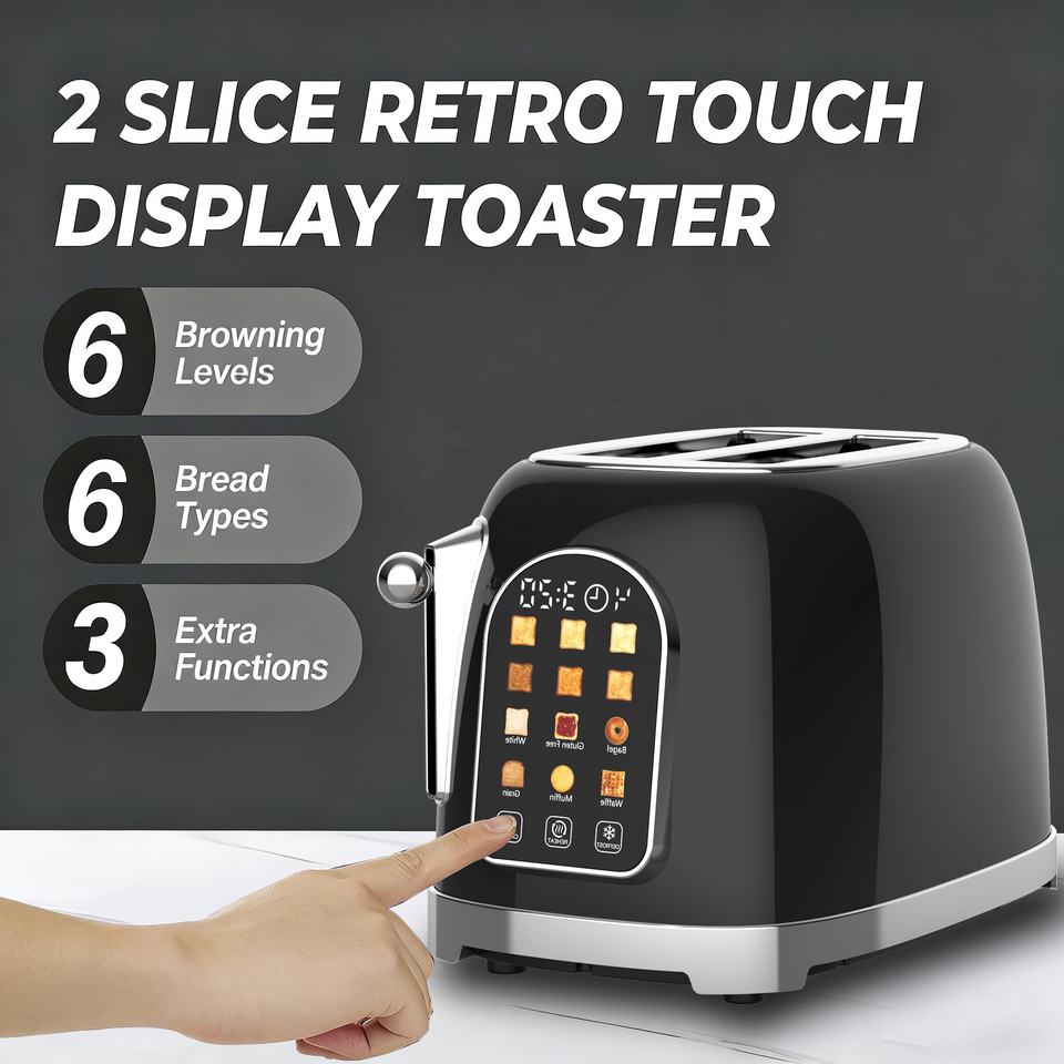Grille-pain électrique rétro 2 fentes en acier inoxydable avec écran tactile, minuteur numérique, 6 types de pain et bac à miettes amovible