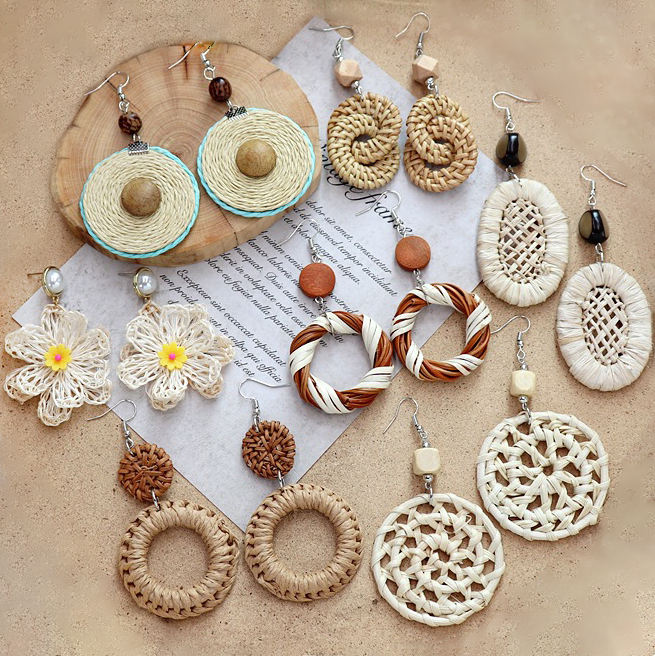 Boucles d'oreilles bohèmes tendance en herbe tressée écologique faites à la main rétro pour femmes, boucles d'oreilles plaquées argent hypoallergéniques