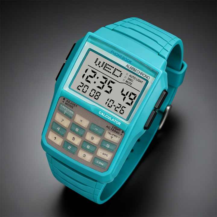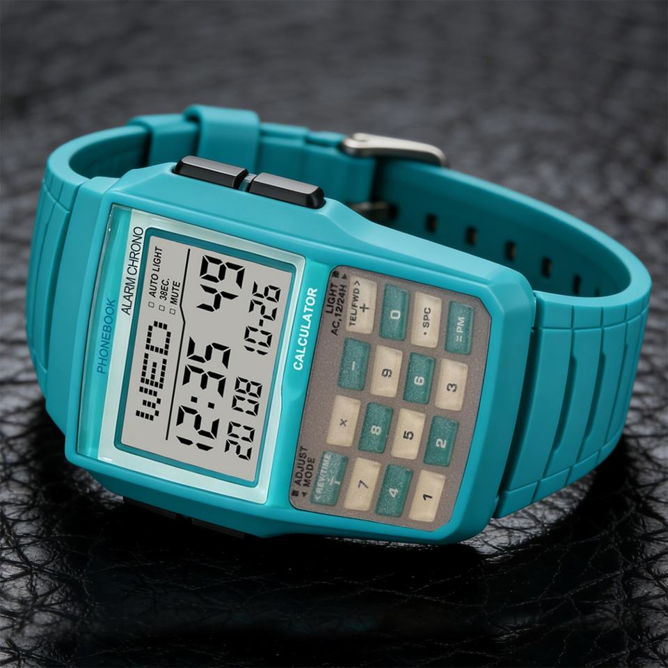 Montre numérique électronique rétro multifonctionnelle à forme irrégulière avec calculatrice, veilleuse LED, alarme sportive unisexe et affichage lumineux