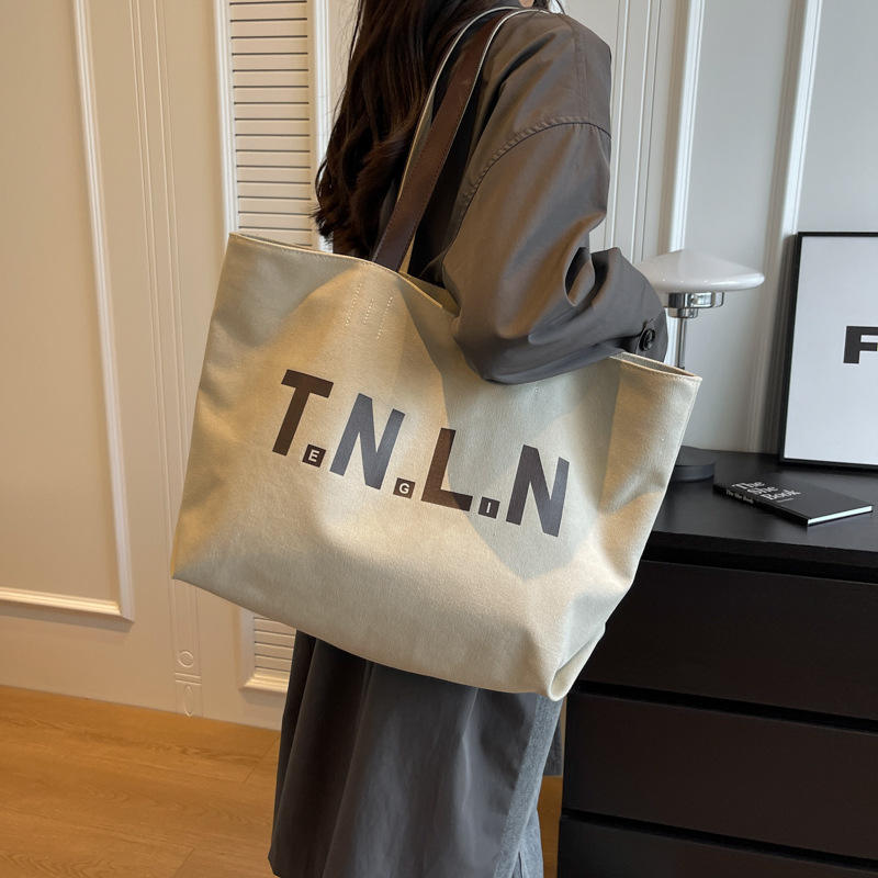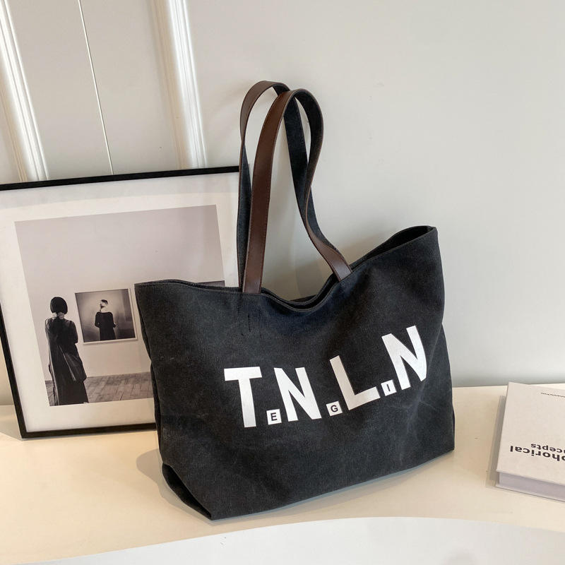 Sac fourre-tout rétro en toile grande capacité avec fermeture éclair en polyester pour femme, nouveau style coréen, tendance et polyvalent, à porter à l'épaule (Tanjing)