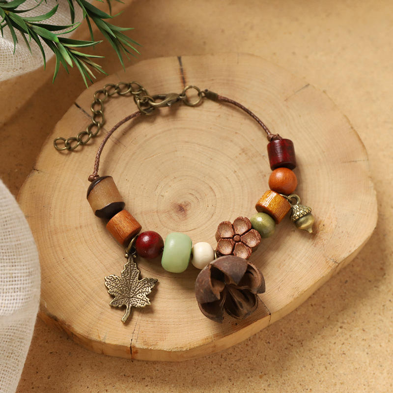 Bracelet rétro chic délavé tressé à la main avec pendentif en forme de fruit naturel et d'acorn, style ethnique artistique