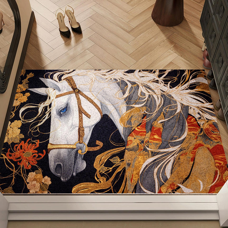 Paillasson rectangulaire en boucle de soie à motif cheval blanc rétro, antidérapant pour intérieur, style design traditionnel