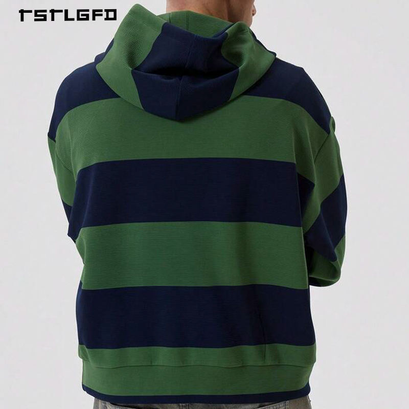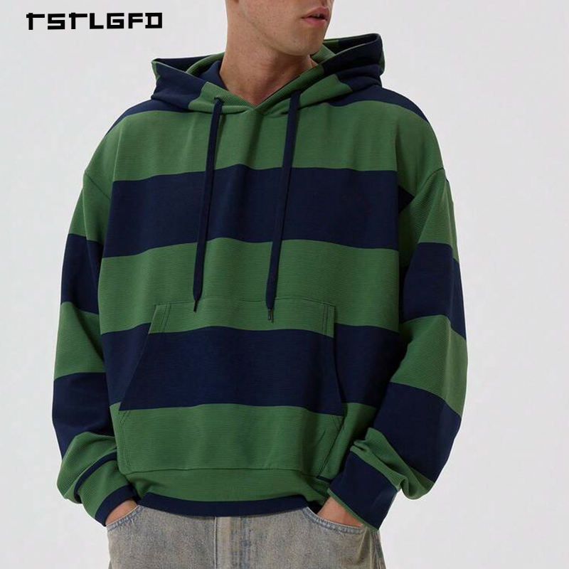 Sweat à capuche rétro à larges rayures avec poche kangourou et cordon de serrage en vert bleu marine, style streetwear, vente en gros