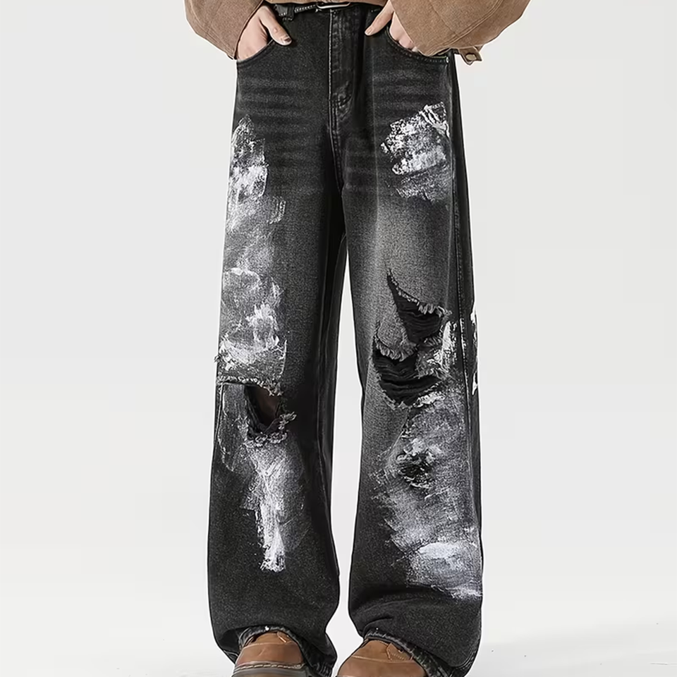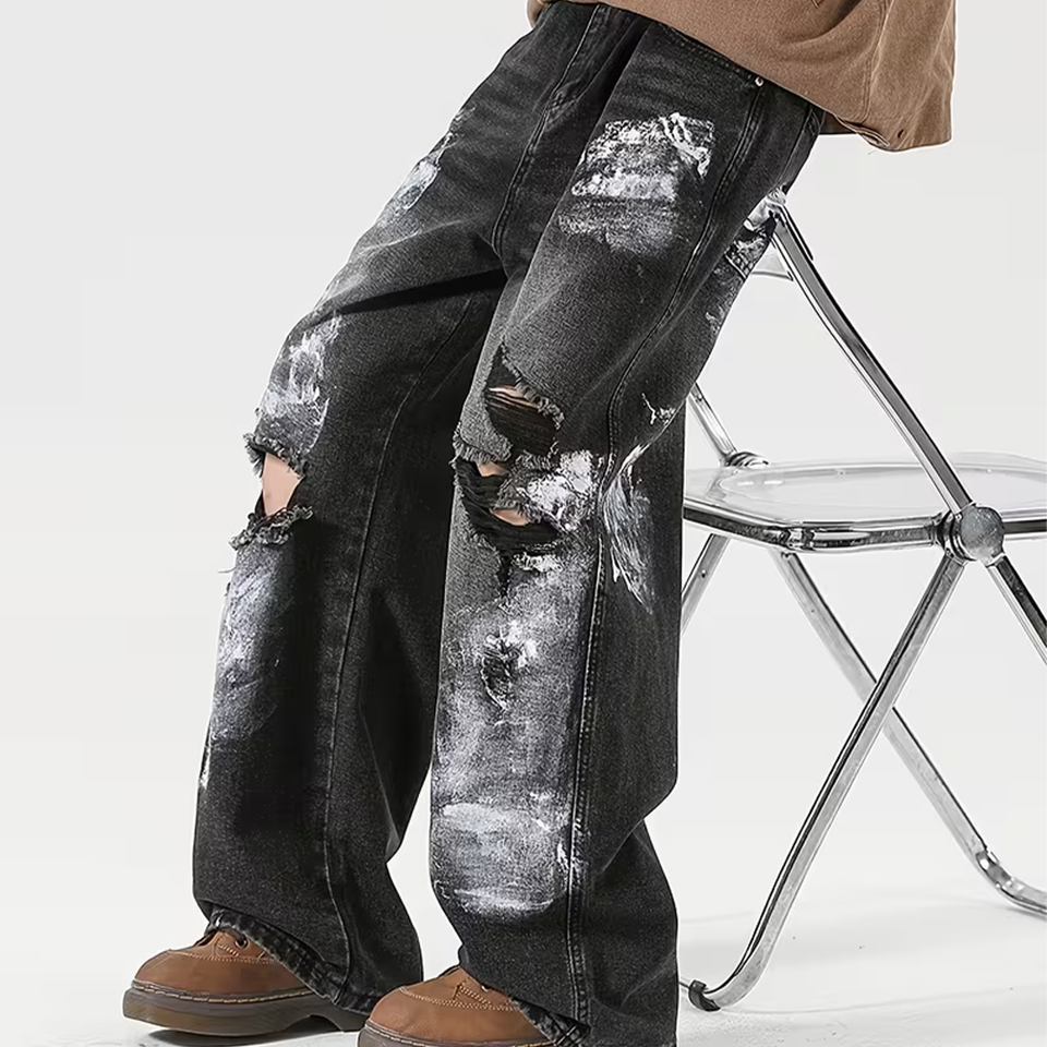 Jeans pour homme en denim délavé rétro Y2K, streetwear asymétrique, pantalon baggy graffiti, vintage déchiré, lavé, effet whisker