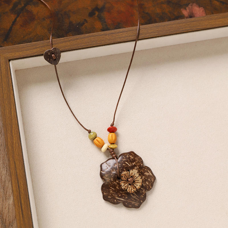 Collier rétro en coquille de noix de coco avec bouton, longue chaîne tressée à motif floral géométrique pour pull, accessoire
