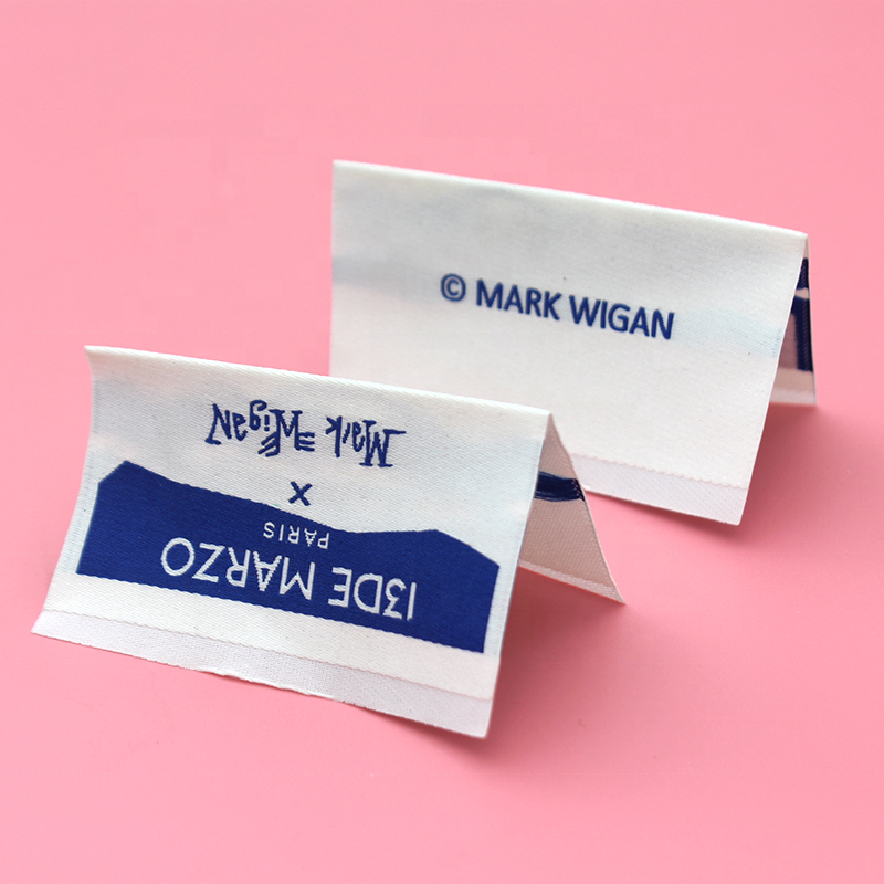 Étiquettes de col et de lavage en satin de polyester tissé haute densité, personnalisées avec logo privé, motif damassé, pliées au centre, pour vêtements