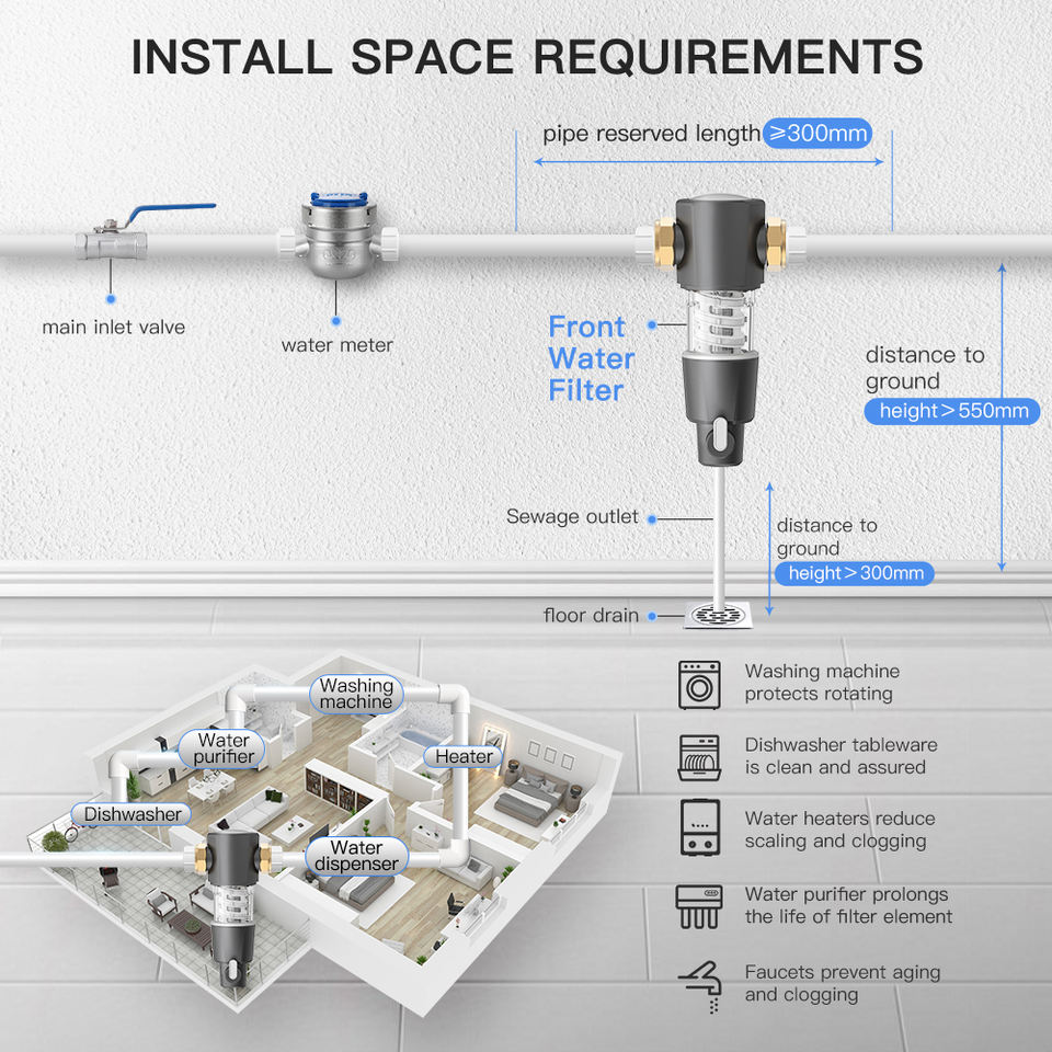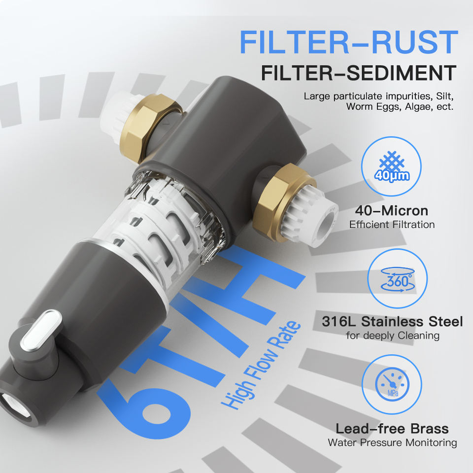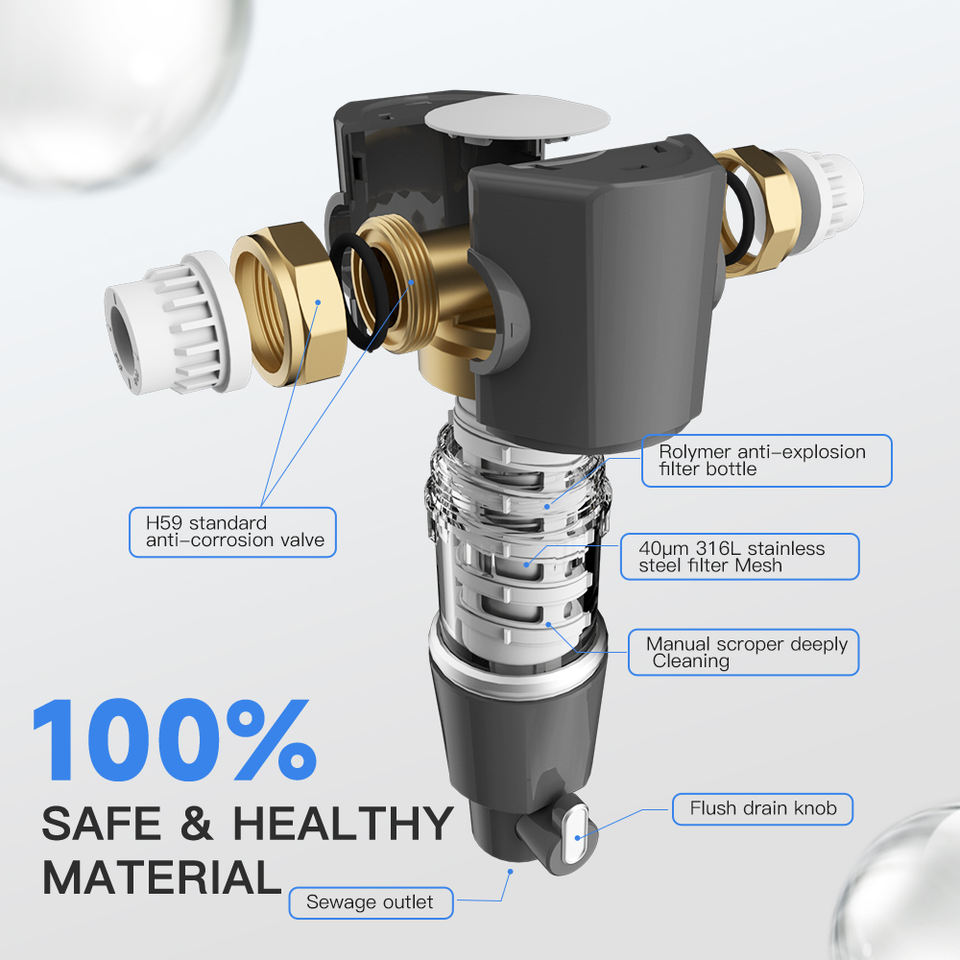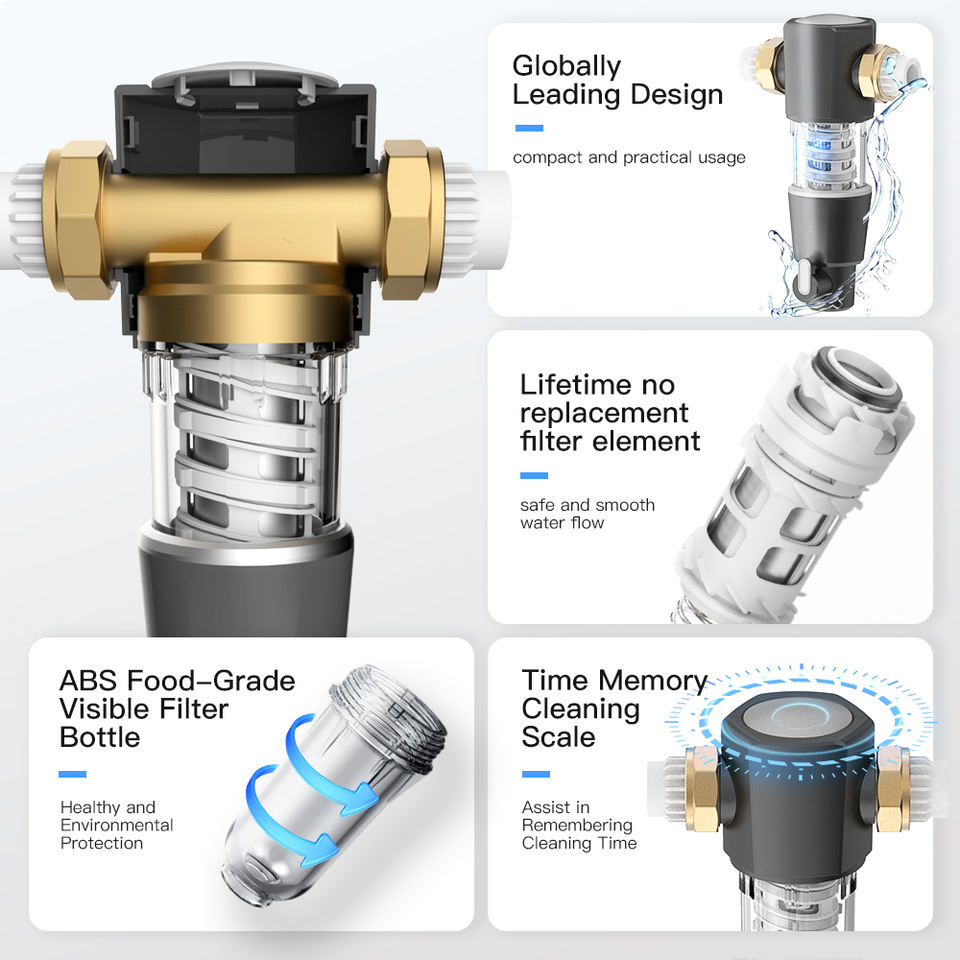 Système de pré-filtre à eau réutilisable de 40 microns purificateur d'eau de toute la maison en laiton de 3/4 pouces propre-lui-même pour le ménage