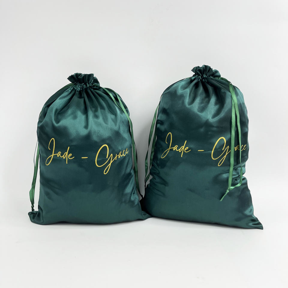 Sacs en satin personnalisés avec logo de marque réutilisables pour emballages capillaires, rubans en satin, sacs à cordon en soie pour cosmétiques verts