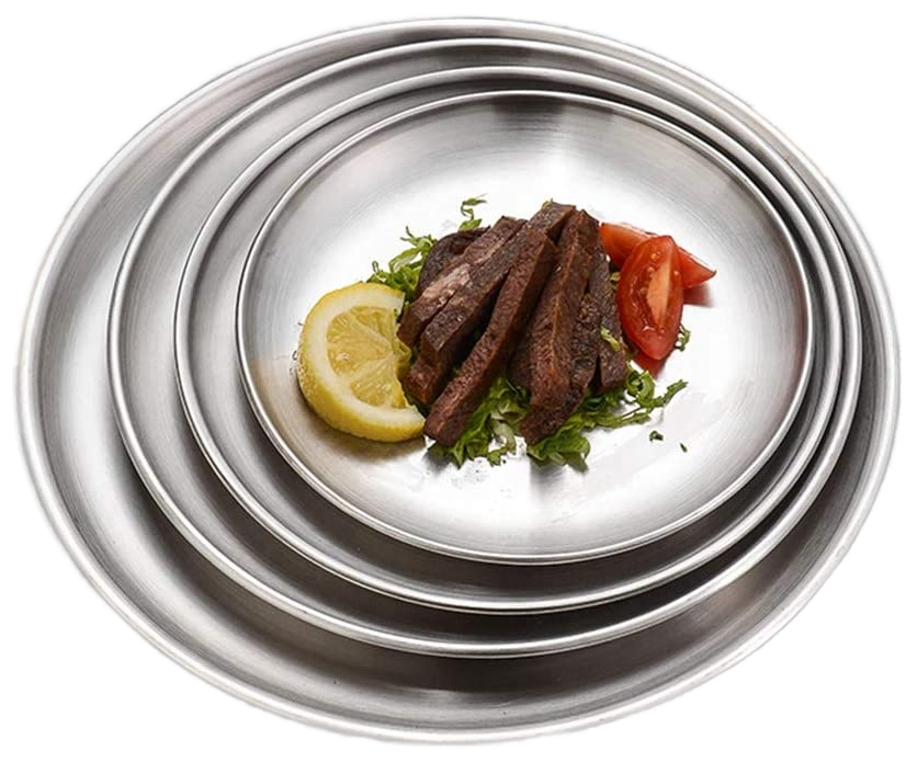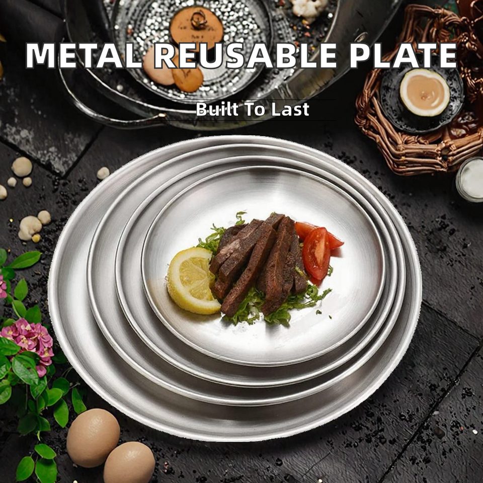 Assiettes réutilisables écologiques en acier inoxydable brossé 18/8, motif végétal vintage, couleur argent, robustes, lot de 4, pour le camping