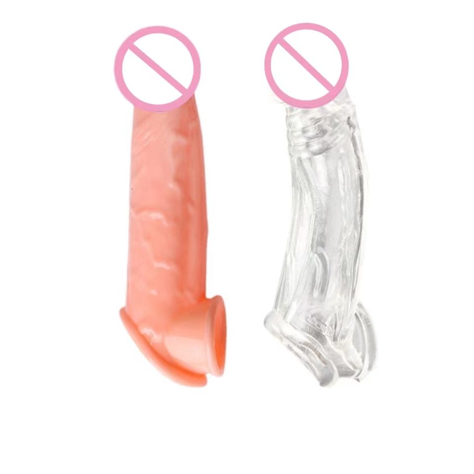Manchon magique en silicone, long, avec extension pénienne en cristal et préservatif en cristal.