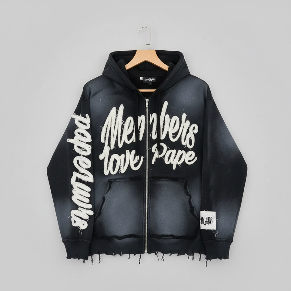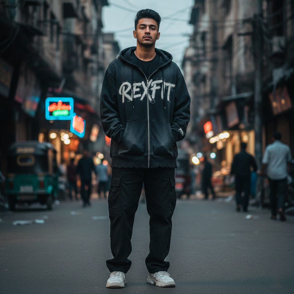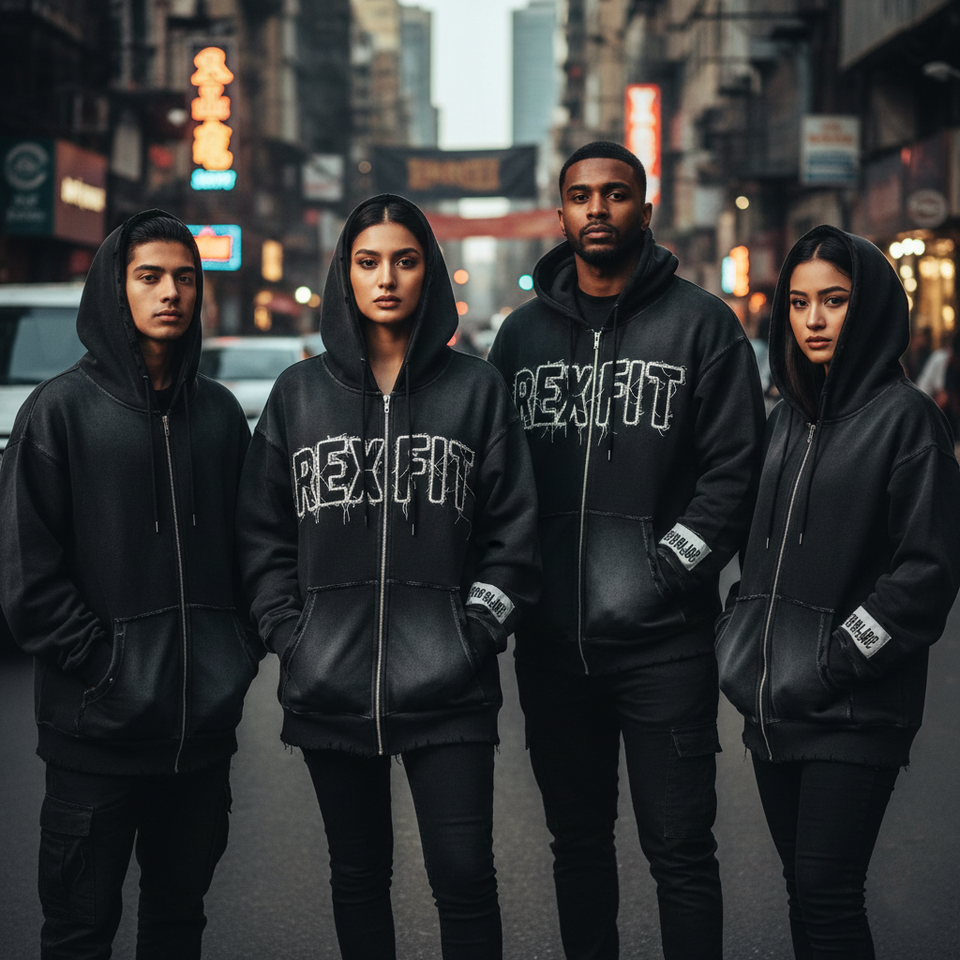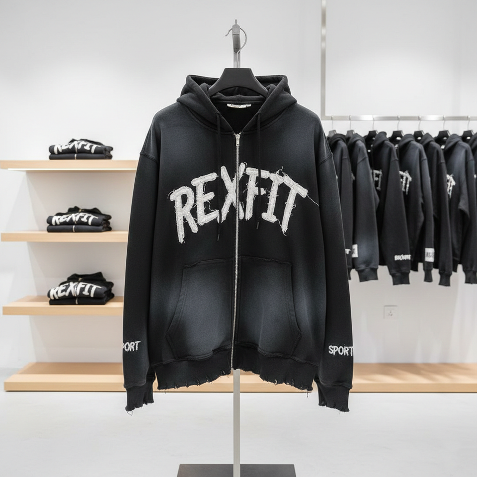 Sweat à capuche zippé Rexfit Sports OEM personnalisé, effet délavé et vieilli, en molleton épais, style streetwear, fermeture éclair intégrale
