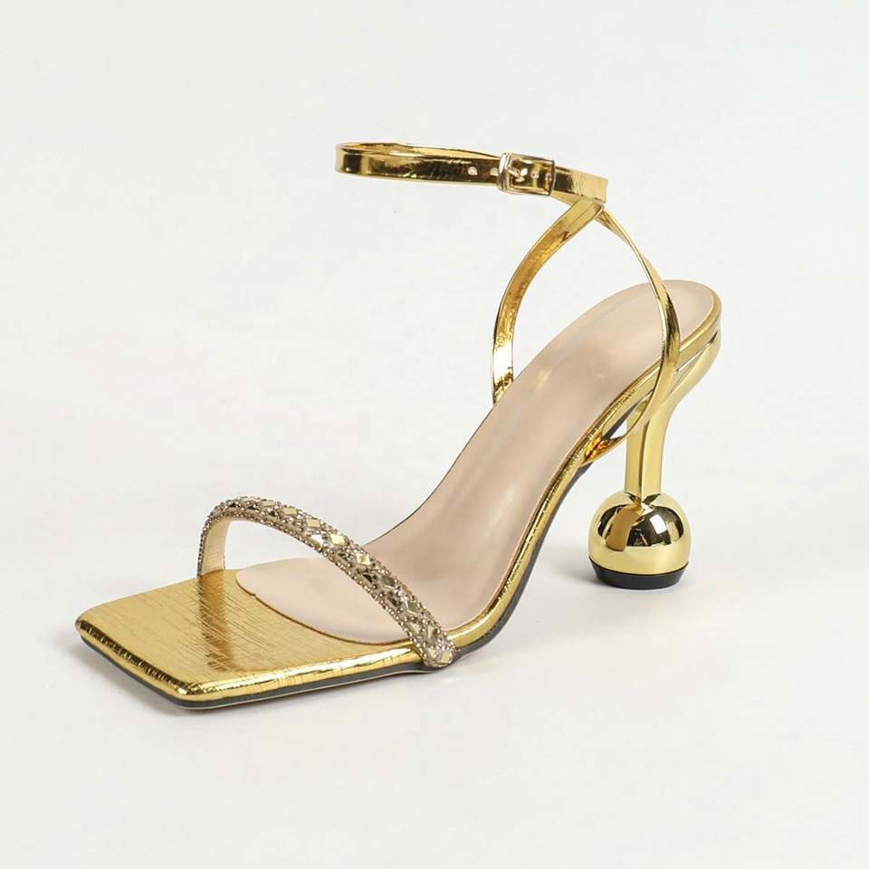 Sandales à talon irrégulier avec strass, bride unique, bride croisée à la cheville, talons hauts dorés, idéales pour les soirées, très tendance