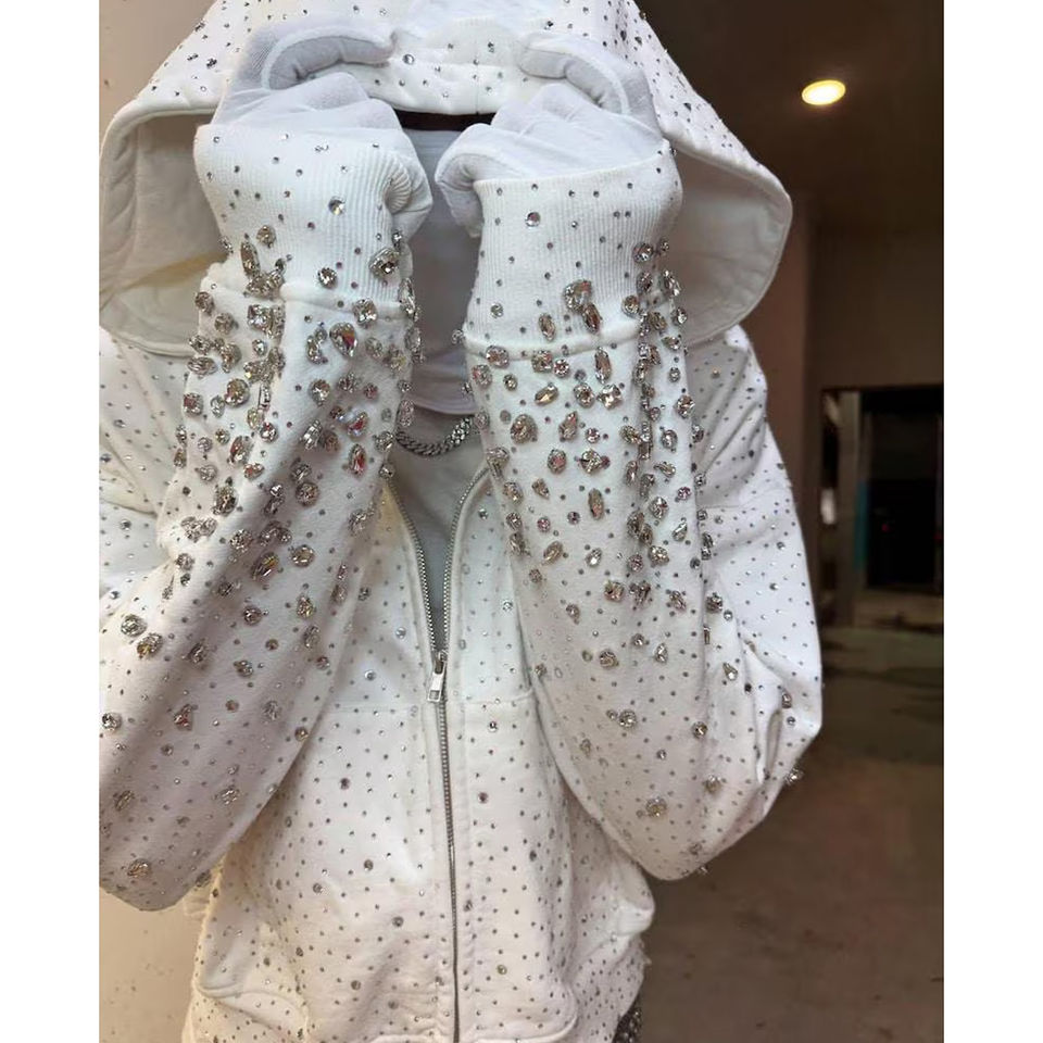 Sweat-shirt à capuche orné de strass, conçu pour un effet visuel chatoyant, coupe décontractée, confort et style décontracté tendance.