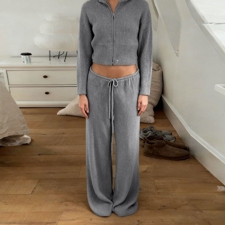 Pantalon en maille côtelée taille haute à jambe large pour femme, avec cordon de serrage, décontracté et ample, pour automne-hiver, blanc et gris, long et fluide