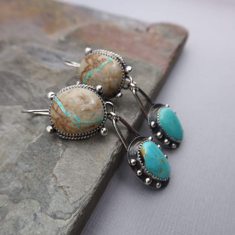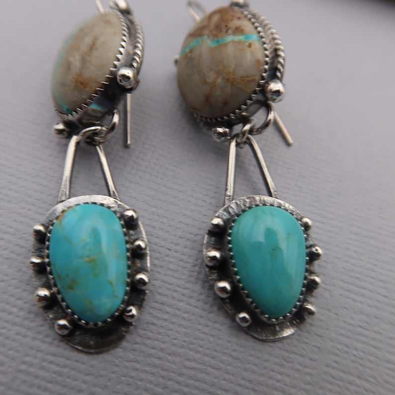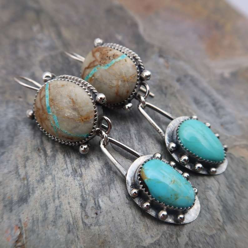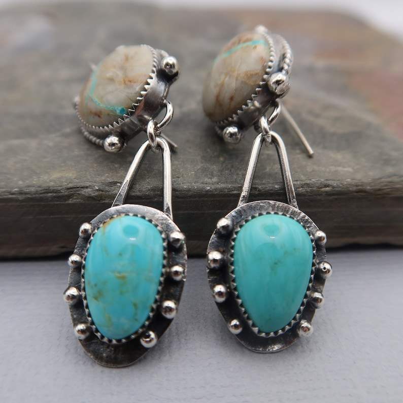 Boucles d'oreilles bohèmes en argent sterling avec sertissage en rhodium, turquoise Manassa, turquoise boulder, ruban, pour anniversaire, style sud-ouest