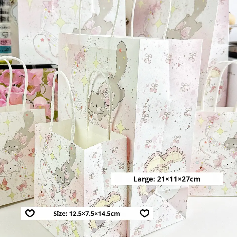 Sac cadeau à main en papier kraft durable de haute qualité avec nœud en ruban, motif chat mignon de dessin animé, pour l'anniversaire d'un meilleur ami