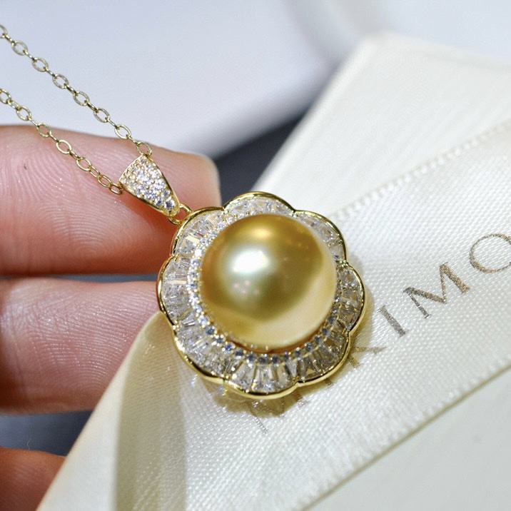 Pendentif en perles d'or riche et prospère 11-12 mm Argent pur incrusté d'or brillant riche Livré avec une chaîne en argent Collier de perles