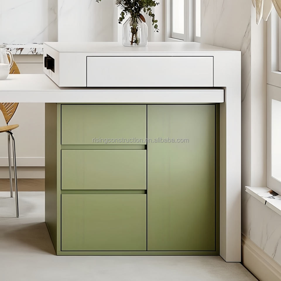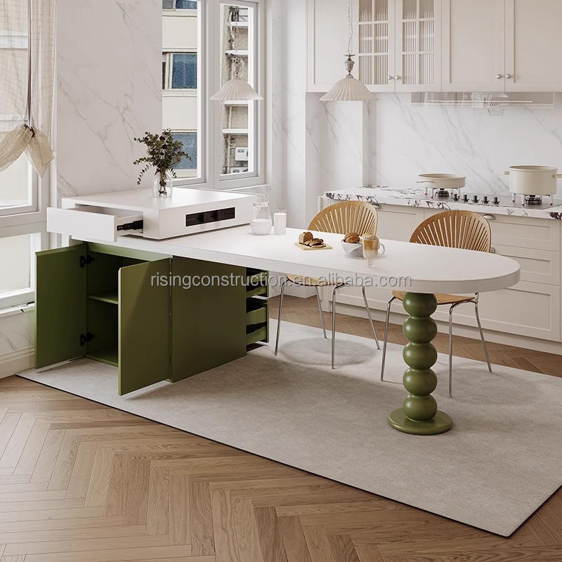 Ensemble table et banc îlot réglable de luxe Rising Light pour usage domestique avec une table îlot rond incurvé et un dessus de table en quartz