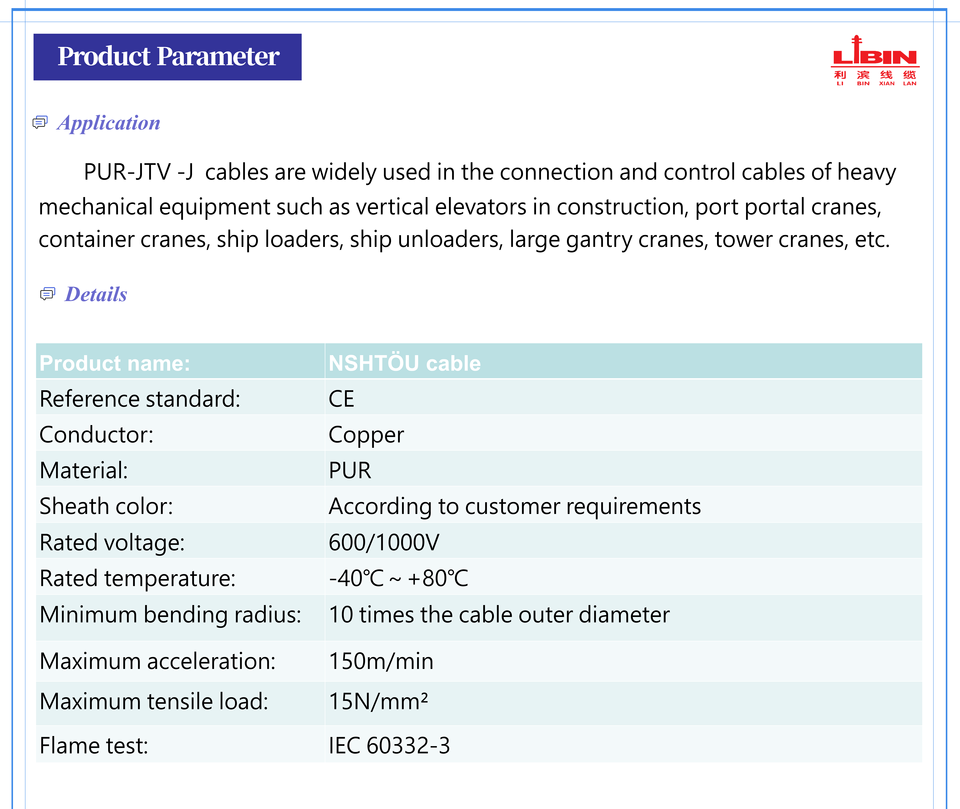Câble industriel robuste et flexible PVR NSHTOU à conducteurs en cuivre toronné 600V/1000V 1 AWG, température -40°C~+80°C