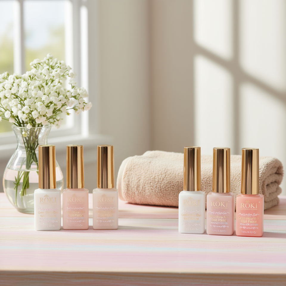 Vernis à ongles gel UV LED Roki One Step, 6 couleurs au choix, semi-permanent, base aqueuse, style design pour nail art, conditionnement en flacon.